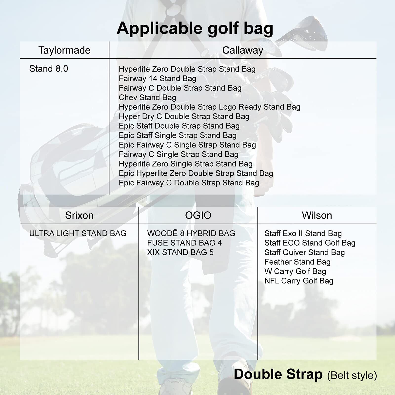 【4点式】理想的には肩紐を四箇所に結ぶ必要がある。バックには二箇所しかない場合は、一箇所に2本固定されていれば、しぶしぶ使うこともできます。適用ゴルフバッグは写真通りにご覧下さい。