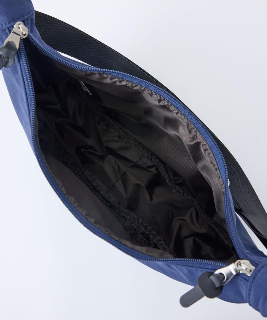 洗いシワのようなヴィンテージ感のある風合いが特徴の生地を使用。風合いを活かすためバッグのデザインは極力シンプルに。人気のバナナ型ショルダーは開口部が広く使い勝手◎外側背面にはファスナーポケットが付いていて、スマホなどをさっと出し入れできます。