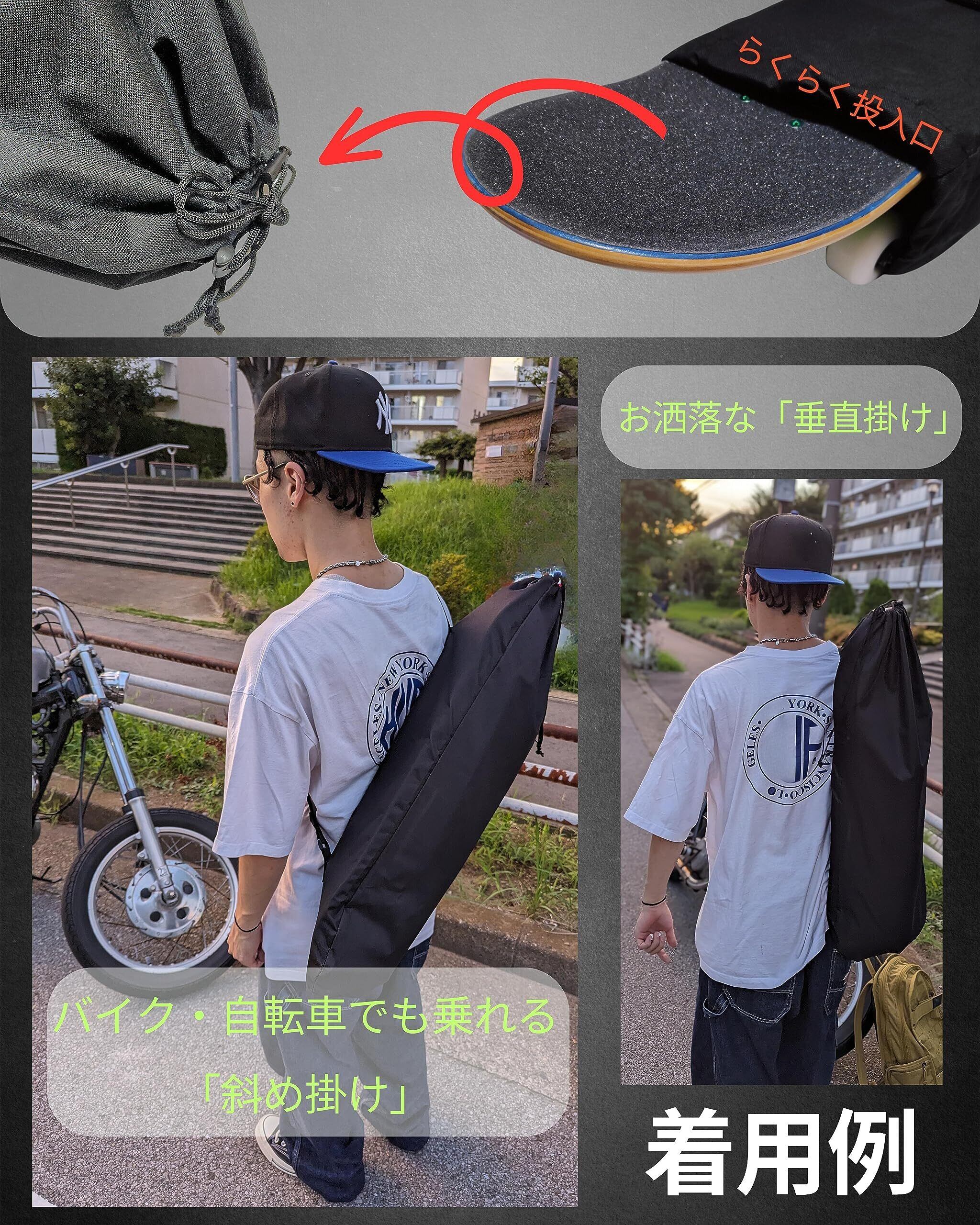 スケートボードがきれいに入るショルダーバッグです、チャリ乗る時に使いやすいのでセッション先までの移動におすすめ!