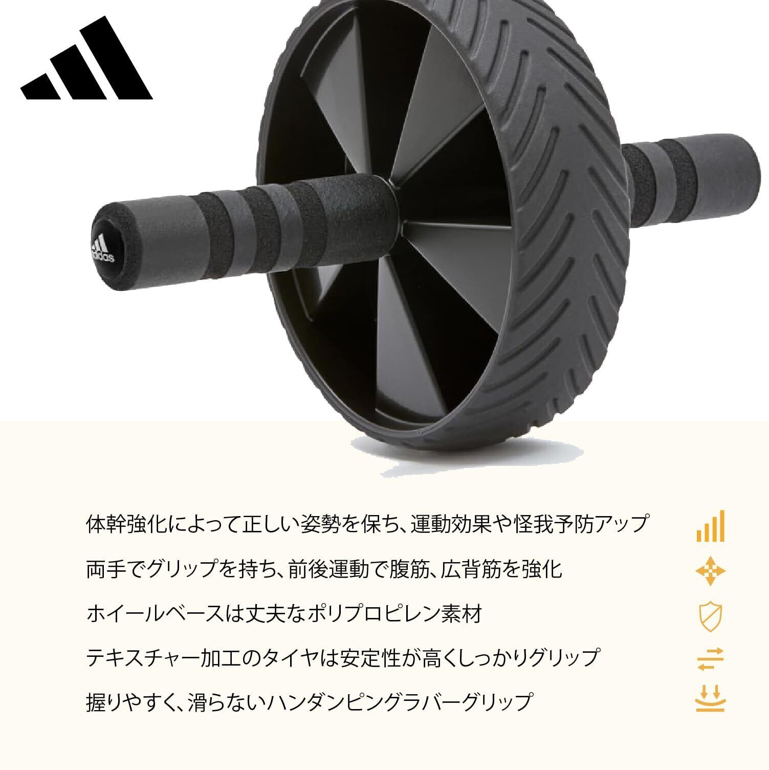 adidas (アディダス) アブホイール になります。・2本のソフトグリップハンドルを取り付けた直径18cmのホイール・姿勢を保ち、動作を支えるコアマッスルを鍛える・身のこなしを向上させるのに役立つ フィットネス・エクササイズ・ジムなど様々なシーンで活躍します。