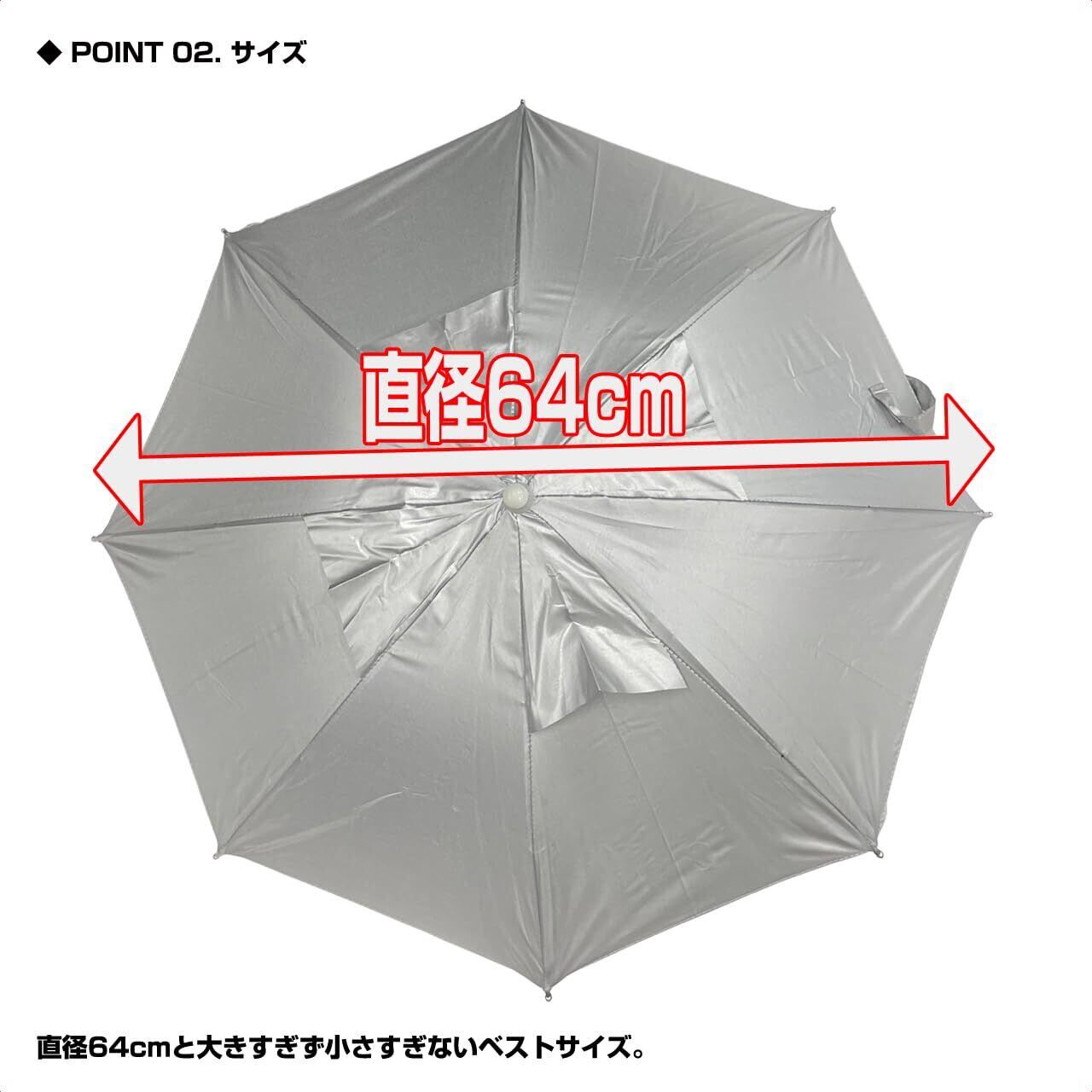 傘タイプの日除けUVカット加工生地使用の帽子。直径64cmで紫外線を広範囲カット。頭部はベルトでサイズ調節可能。あご紐付なので風でも飛ばされません。