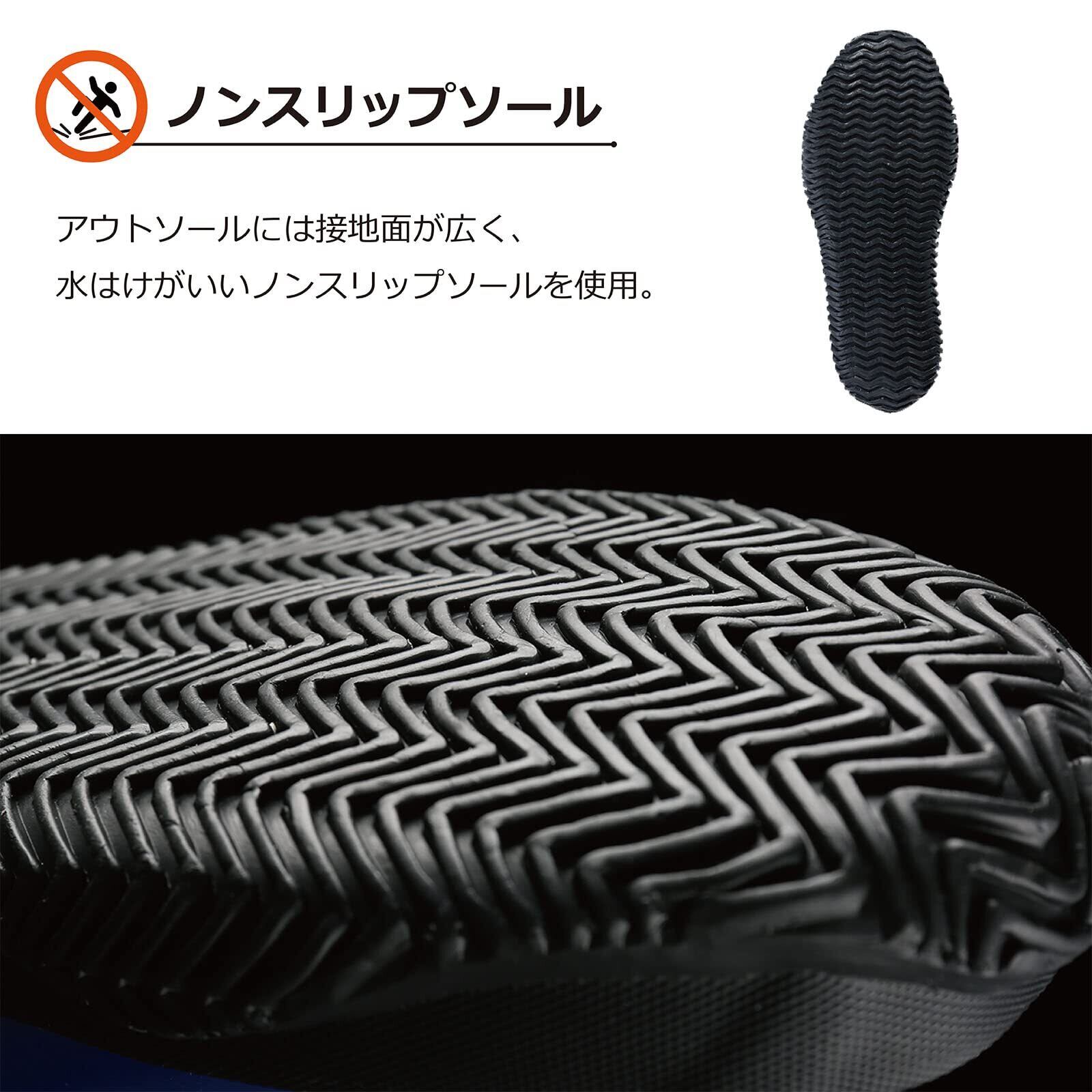 激しい動きに対応できるように、甲を低くして足首を細くし、フィット感をアップさせています(さらにフィット感をアップさせるためには、ご自身に合った中敷きを使用してください)。アウトソールは接地面が広く、水はけがいいノンスリップソールを使用しています。