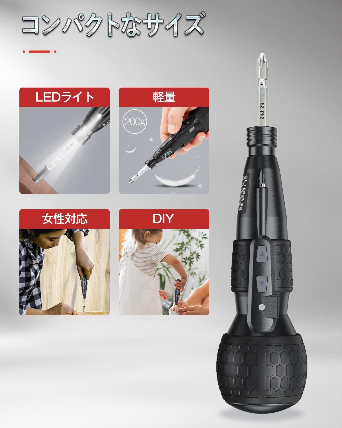 【コンパクト・軽量・コードレス設計】手軽なサイズ感と軽量設計で長時間の作業も楽にできる電動ドライバーです。本体は約200gの軽量設計、女性にもストレスなく長時間使用できます。充電式コードレスタイプでどこでも気軽に作業できます。コンセントがない場所でも使えるうえ、作業中にコードが邪魔にならず取り回しが格段に優れています。