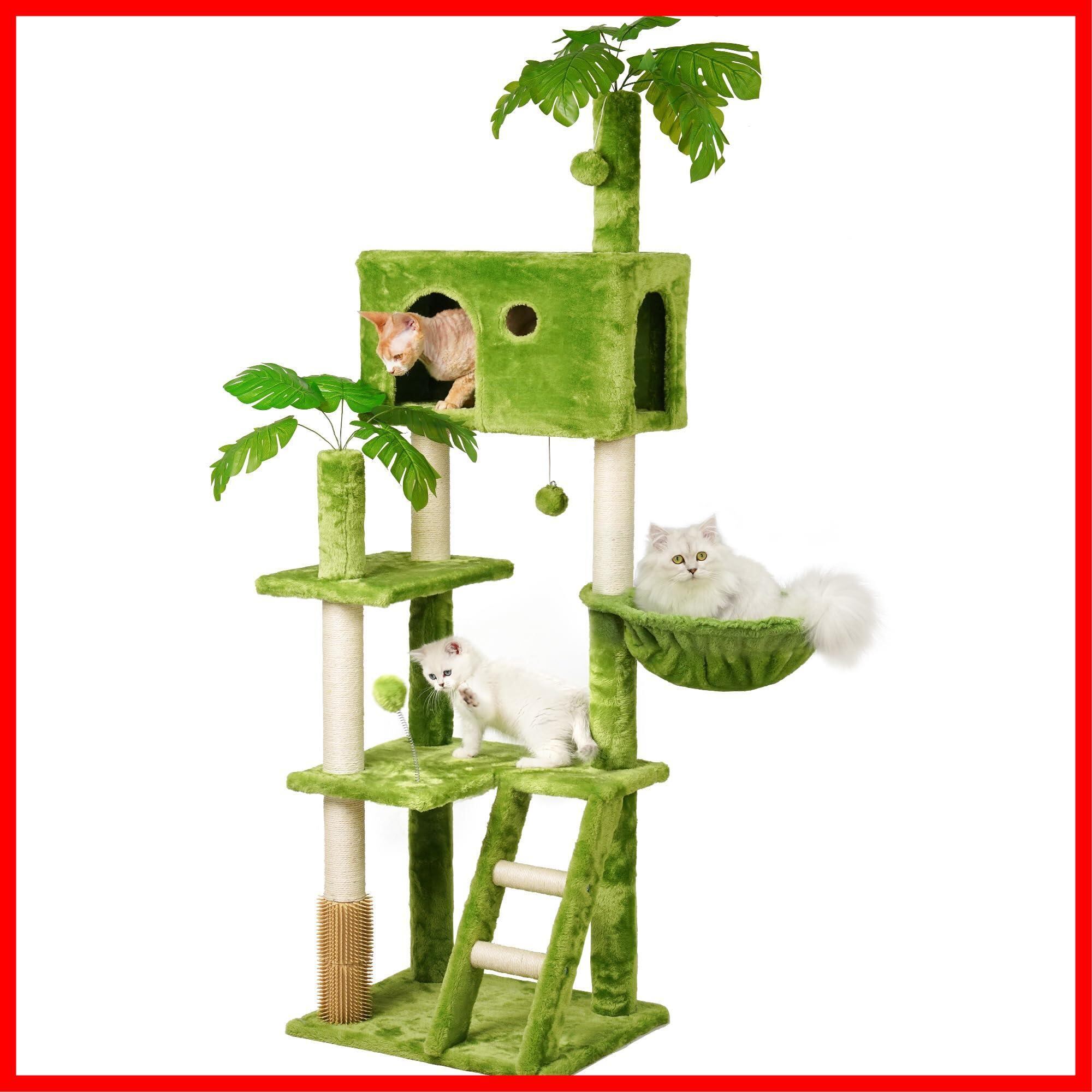 Meecal キャットタワー 大型猫用 葉付き 猫タワー 多頭飼い 耐荷重10KG キャットタワー大型 爪研ぎポール ハンモック 転倒防止装置 キャットハウス 猫 マッサージ 天然麻紐 展望台 階段 遊びのポンポン - グリーン 高さ165cm | ニコニコshops
