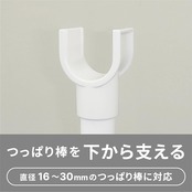 お手持ちのつっぱり棒(外径30mm以下)に組み合わせるだけ。突っ張り棒をしっかりサポート。高さは69mから115cmで押入れやクローゼットに対応可能。※突っ張り棒は別売りです。