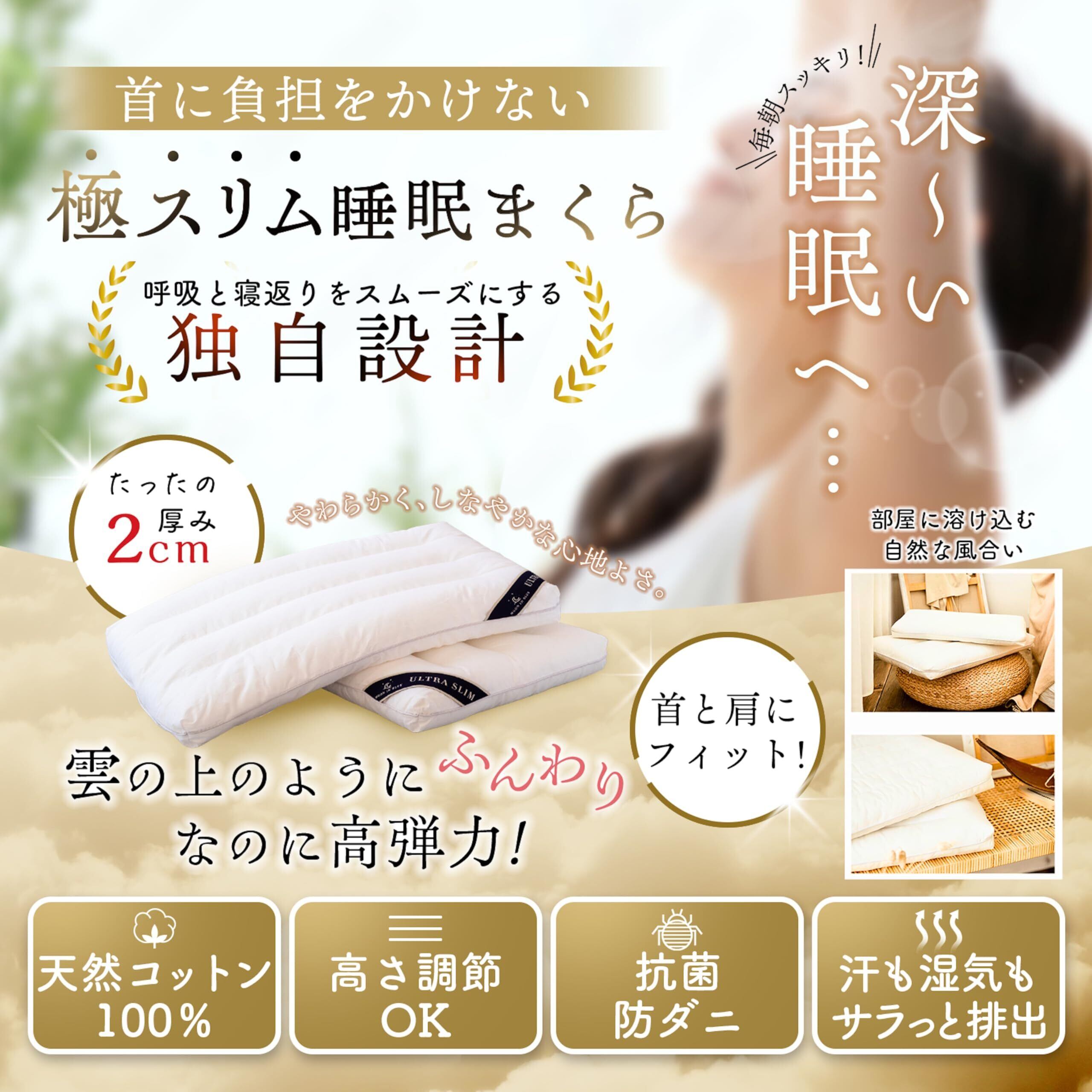 極スリム2cm 睡眠まくら ”低さ”と”寝心地”を追求 首や肩の負担を減らす 枕 低め 低い枕 薄い枕 薄い 洗える 第三者機関で洗濯テスト済み 整体師が推薦 柔らかい枕 通気性 高さ調整 天然コットン (40×60cm/極スリム2cm) | ニコニコshops