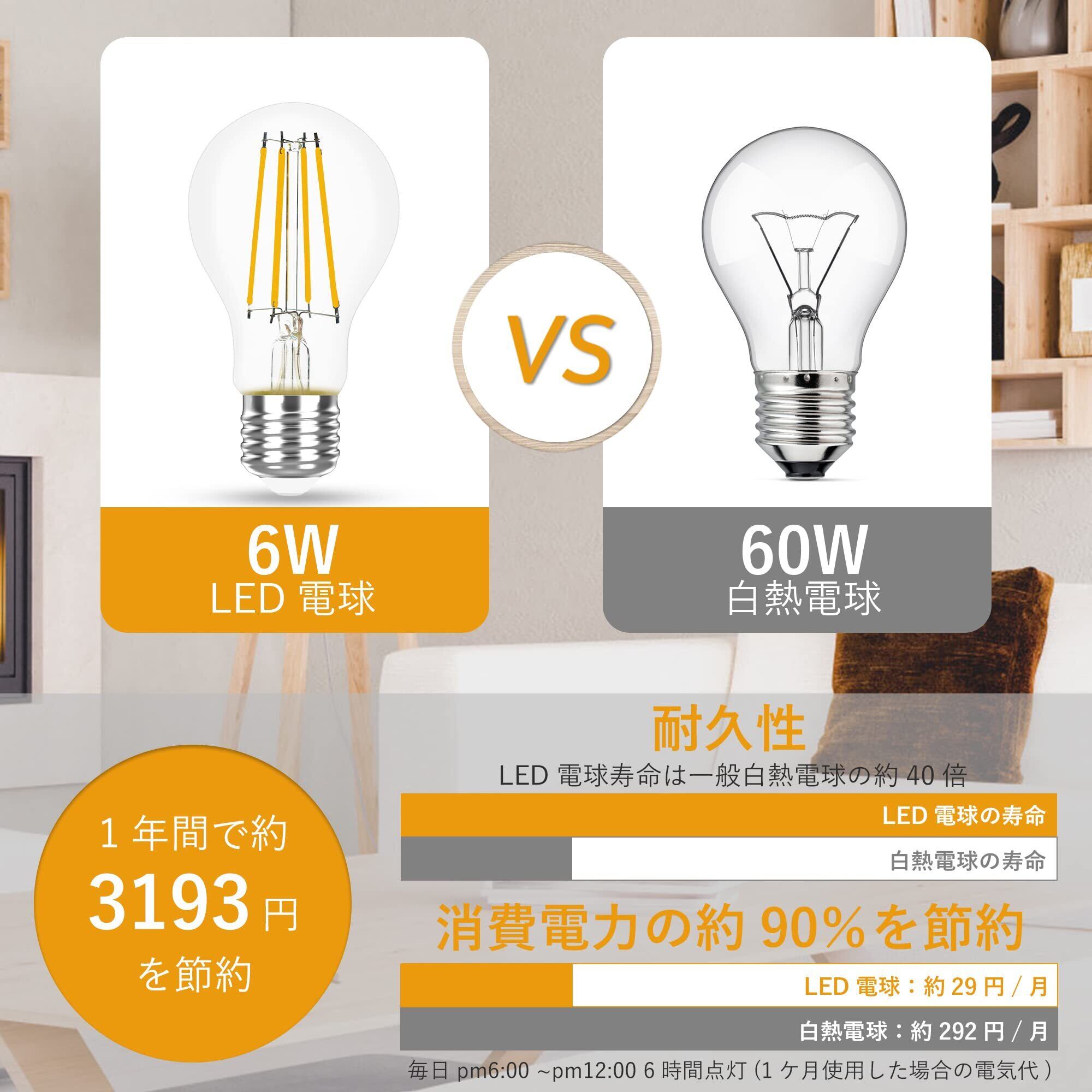 LED電球 口金直径26mm 60W形相当 電球色 フィラメント電球 A60 6W 810lm 広配光タイプ クリアタイプ レトロ電球 高演色 非調光 2個パック 【適格請求書発行可】 | ニコニコshops