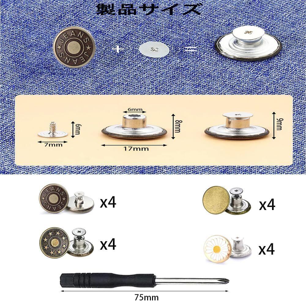 【商品仕様】直径17mm,ジーンズボタン×16個(4タイプ各4個)+専用ドライバー×1本。カラー:ブロンズ。 【便利性】工具不要、縫製不要、 取り付けと取り外し簡単です。 誰でも使用できます。再利用可能です。 【高品質素材】高品質の金属材料で作られたボタンピンで、丈夫で耐久性があり、腐食しにくいです。 指の圧力で曲がったり折れたりしません。 【ウエスト増減可能】ジーンズのボタンピンで1インチ(約2.5cm)のスペースを確保したり、ウエストが緩すぎると1インチ(約2.5cm)のスペースを減らしたりできます。 ウエストバンドは大小に変更でき、取り外し可能で、調整はしっかりしていてます。 ユニークなスロットデザイン、両面メッキ加工、耐久性とエレガントさ。 スタックしても脱落せず、カードと同じくらいタイトになります。 ボタンのこれらのクリップを試して、腰の快適さの問題を克服してください。 【幅広い用途】 ウエストを調節できるだけでなく、シャツの襟飾りやカフスボタンとしても使え、さまざまな方法で組み合わせることができます。ジーンズ、ショーツ、帽子、スーツ、パンツ、作業服、DIYの手工芸品、ジャケットなどのあらゆる種類のものに適用します。フォーマルでもカジュアルでも使用できます。 女性、男性、10代、大人にも適しています。