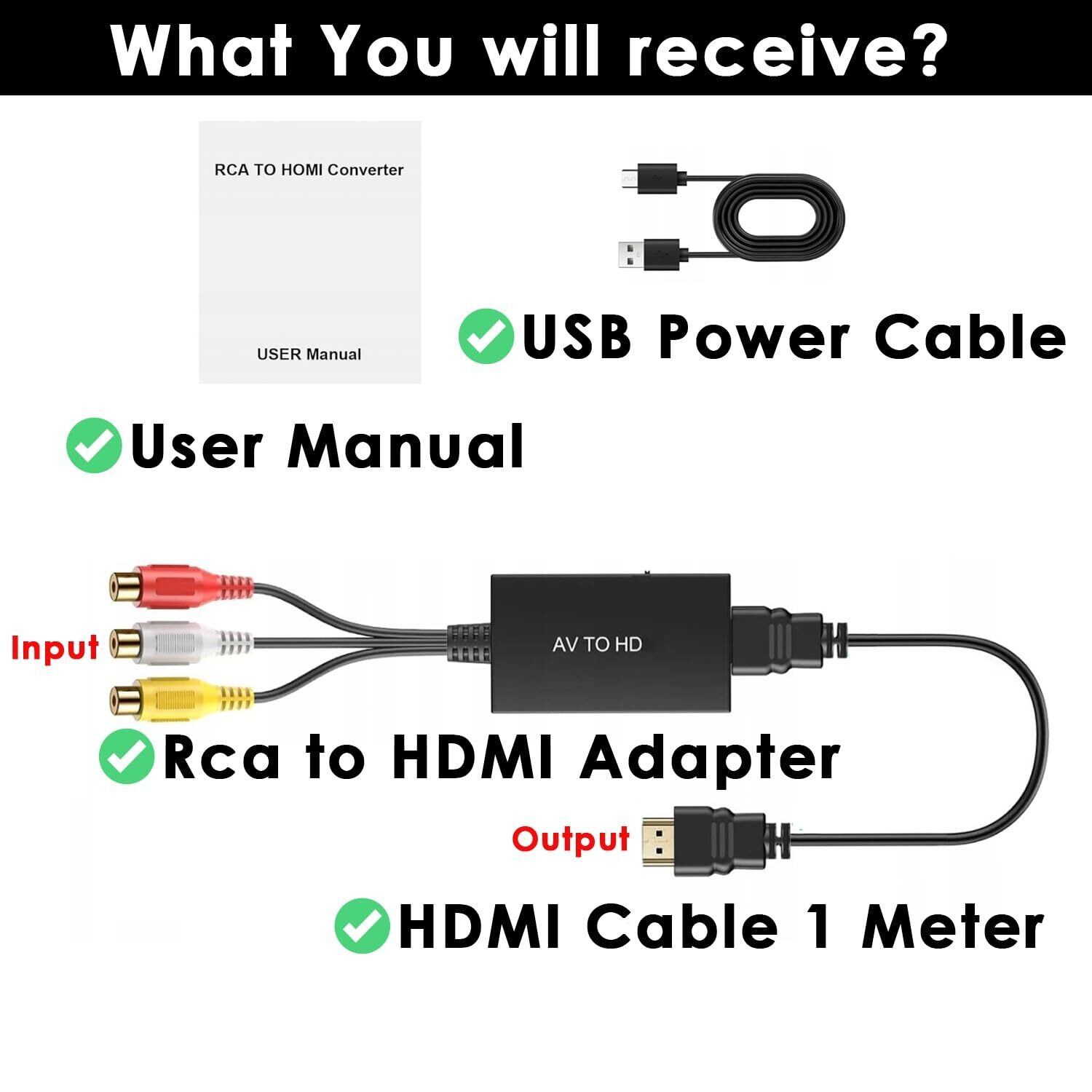 【RCA to HDMI 変換コンバーター 】 RCAコンポジット(赤、白、黄)入力をHDMI 720P/1080P(60HZ)出力に変換し、HDTV/モニターに表示します。 ドライバーは必要なくて、プラグアンドプレイするだけです。 【単方向通信対応のみ】