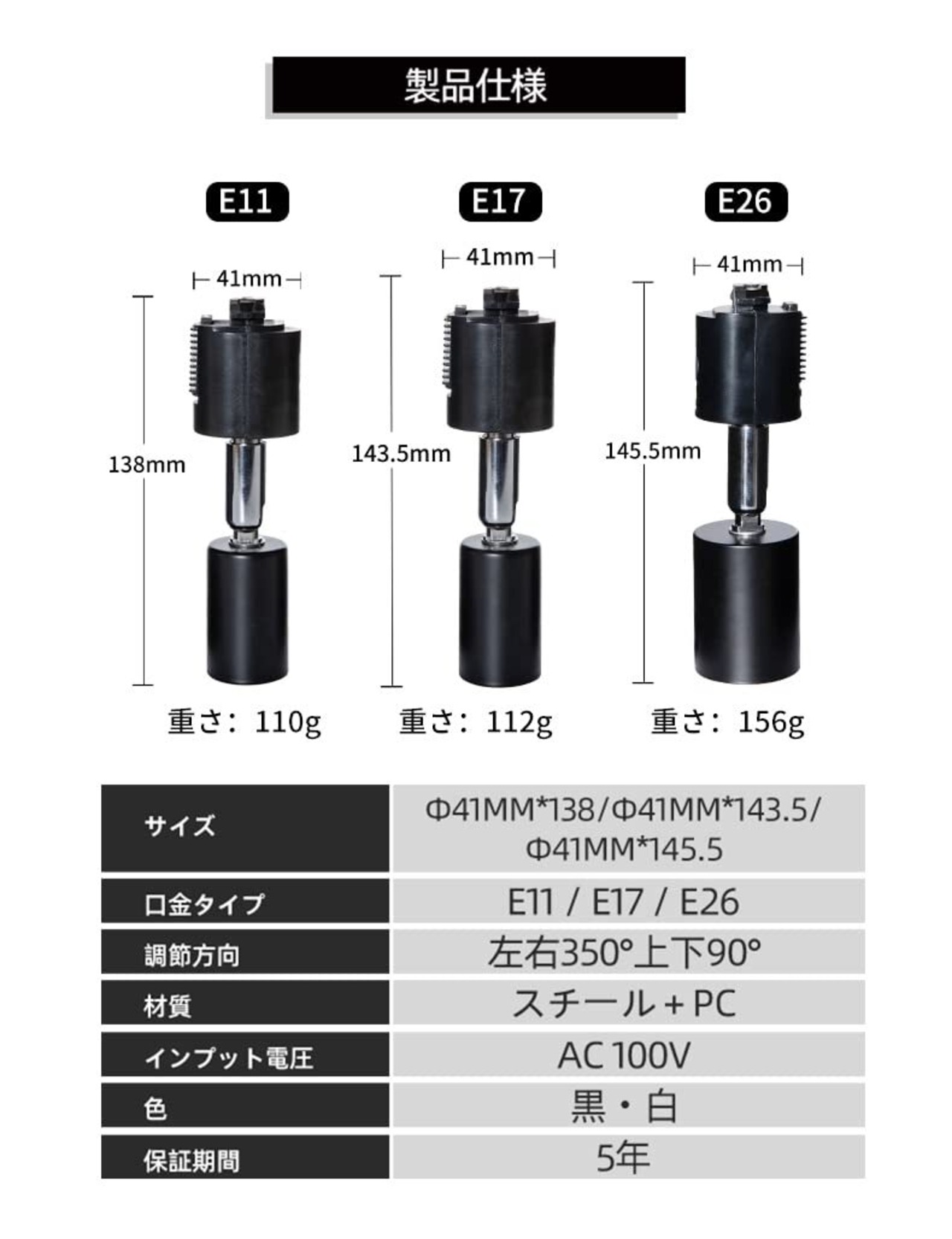 2.室内レールランプ用の専用取付器具。単品重量:110g;色:黒;定格電圧:AC100V;E11灯具との組合せでご利用可能。