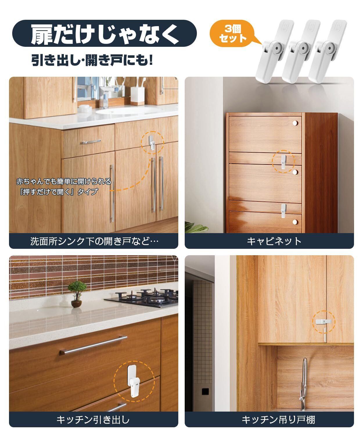【扉だけじゃなくて引き出し&開き戸&三個セット】このdoor lockは、市販のほとんどのt扉のドアノブに対応可能です。ドアノブ内側はドアに3cm以上距離あればいいです。また、窓ロックにもできます。扉だけじゃなくて引き出し&開き戸にも! キャビネット;キッチン吊り戸棚;地震による散乱防止にも;キッチン引き出し;洗面所シンク下の開き戸など可能です!さらに3個セット、家のドアに満足できます!