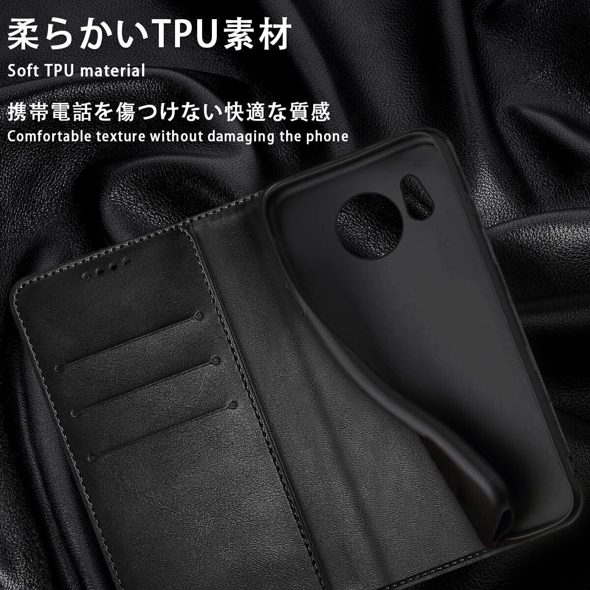 【耐衝撃性】耐熱性と柔軟性を誇るPUレザーから作られていて、滑りにくく、指紋、油分などもつきにくく、手帳型ならではの全面保護機能でディスプレイはもちろん、背面もしっかりガードします。さらにカメラレンズ保護構造でスマホ本体を傷から360度しっかり保護してくれます。