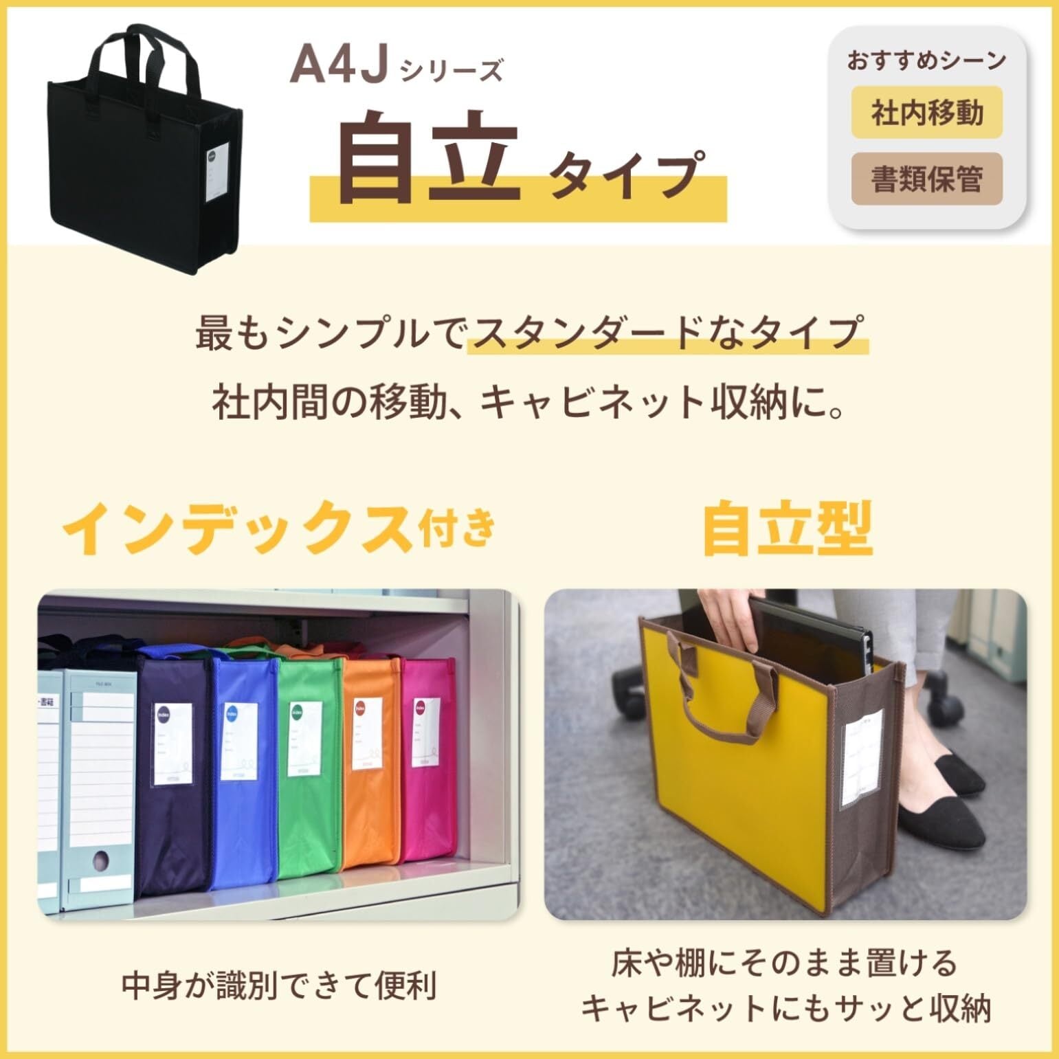 ・個人の席が決まっていないフリーアドレスのオフィスや、車や徒歩でカタログを持ち歩く営業の方、又デスクの下に立てて置けるのでちょっとした保管に便利です。