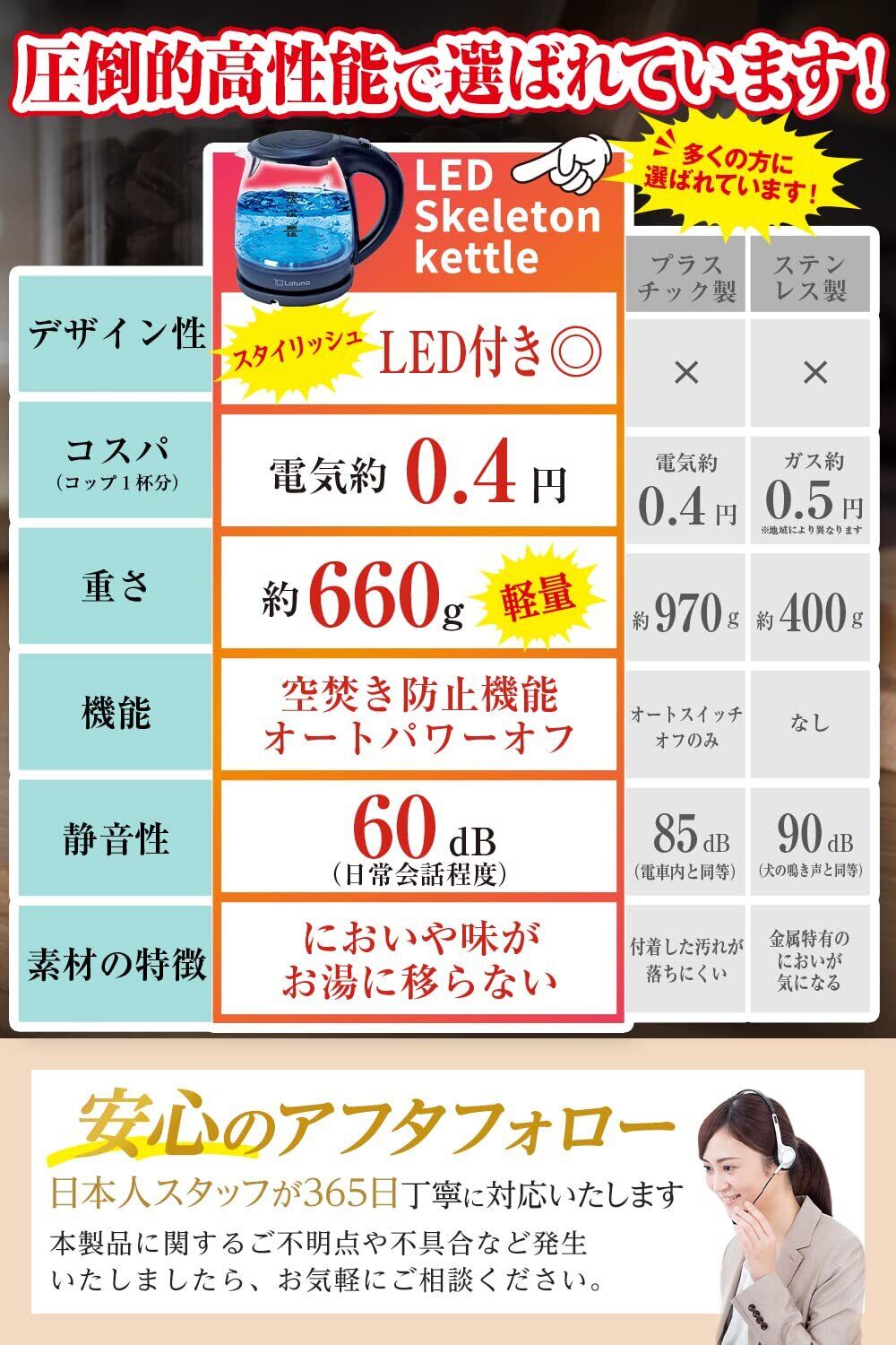 電気ケトル ガラス ケトル 湯沸かしケトル LEDライト付 電気 ポット 【コップ1杯95秒】 1.0L [Latuna ラチュナ] コーヒー 湯沸かしポット 小型 おしゃれ 紅茶 お茶 空焚き防止 PSE認証済み (ブラック)