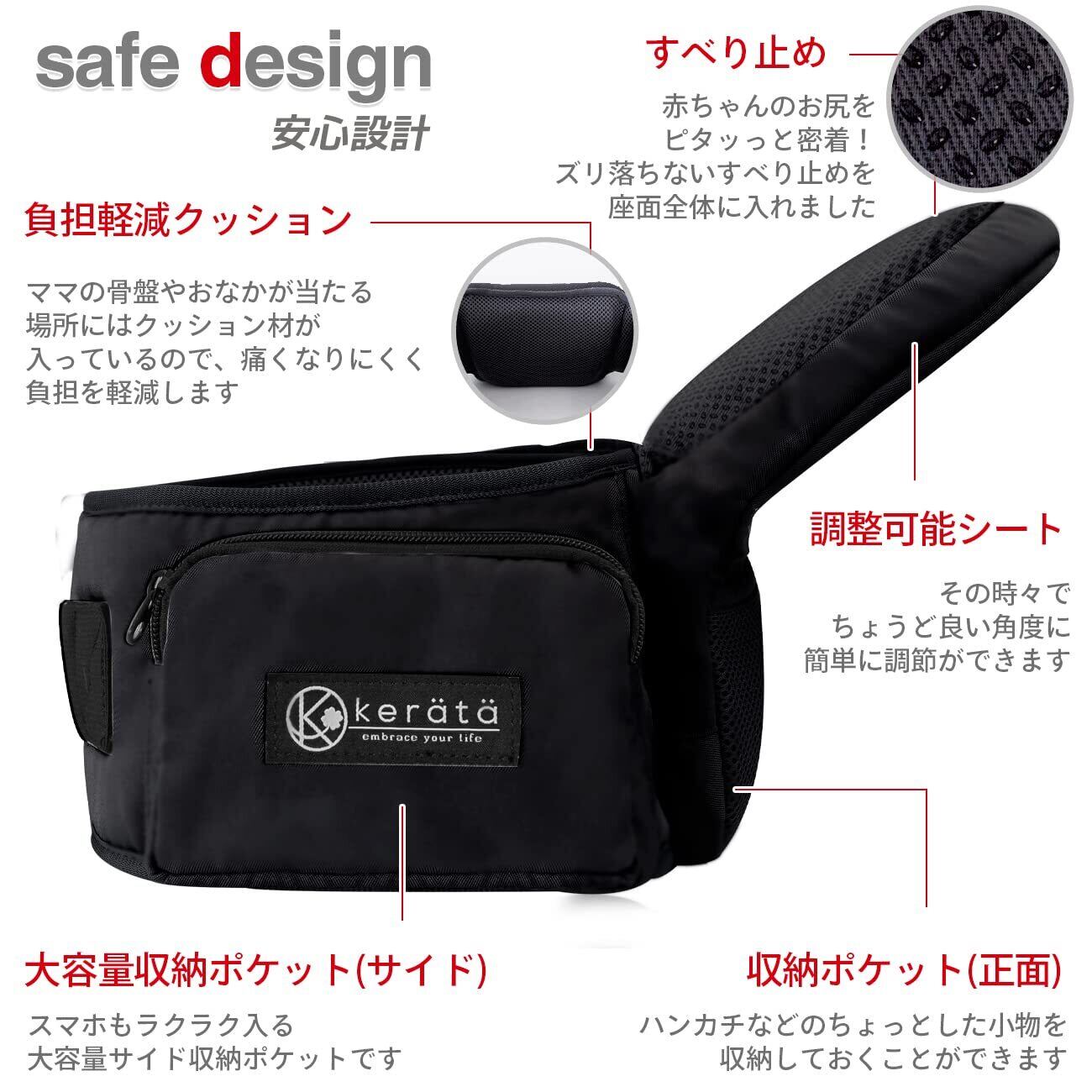 他にもオススメpointがいっぱい!《point1.すべり止め付き》赤ちゃんの座るシート部には滑り止めを施しました。ズレ落ちる心配が無いので安心です。《point2.メッシュでムレ防止》ママパパの腰回りなど、体と密着する部分はメッシュ仕様になっているので、長時間装着していてもムレにくく快適にお使い頂けます。《point3.腹部の負担を軽減するクッション》腰ベルト内側のおなかに当たる部分はクッション仕様になっているので、ママパパのお腹への負担を軽減します。《point4.2重で固定する腰ベルト》腰ベルトはマジックテープでベルトを固定した後にバックルを留め、固定します。2重でしっかり固定されるので安心です。