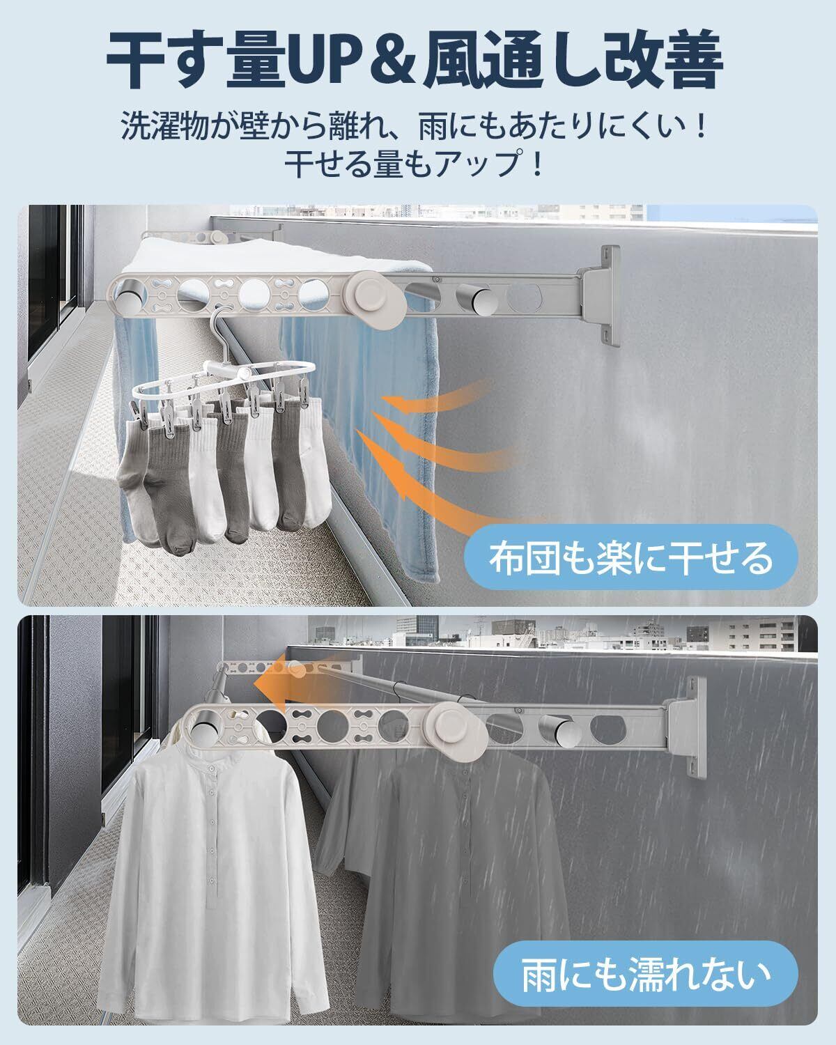 5.【壁から離れ】:壁に洗濯物が当たらないため、本製品を並行して使用することで、洗濯物が壁から離れ、風で揺れてくっついても汚すことがなく、雨にもあたりにくい。狭いスペースでも快適に洗濯物を干す!
