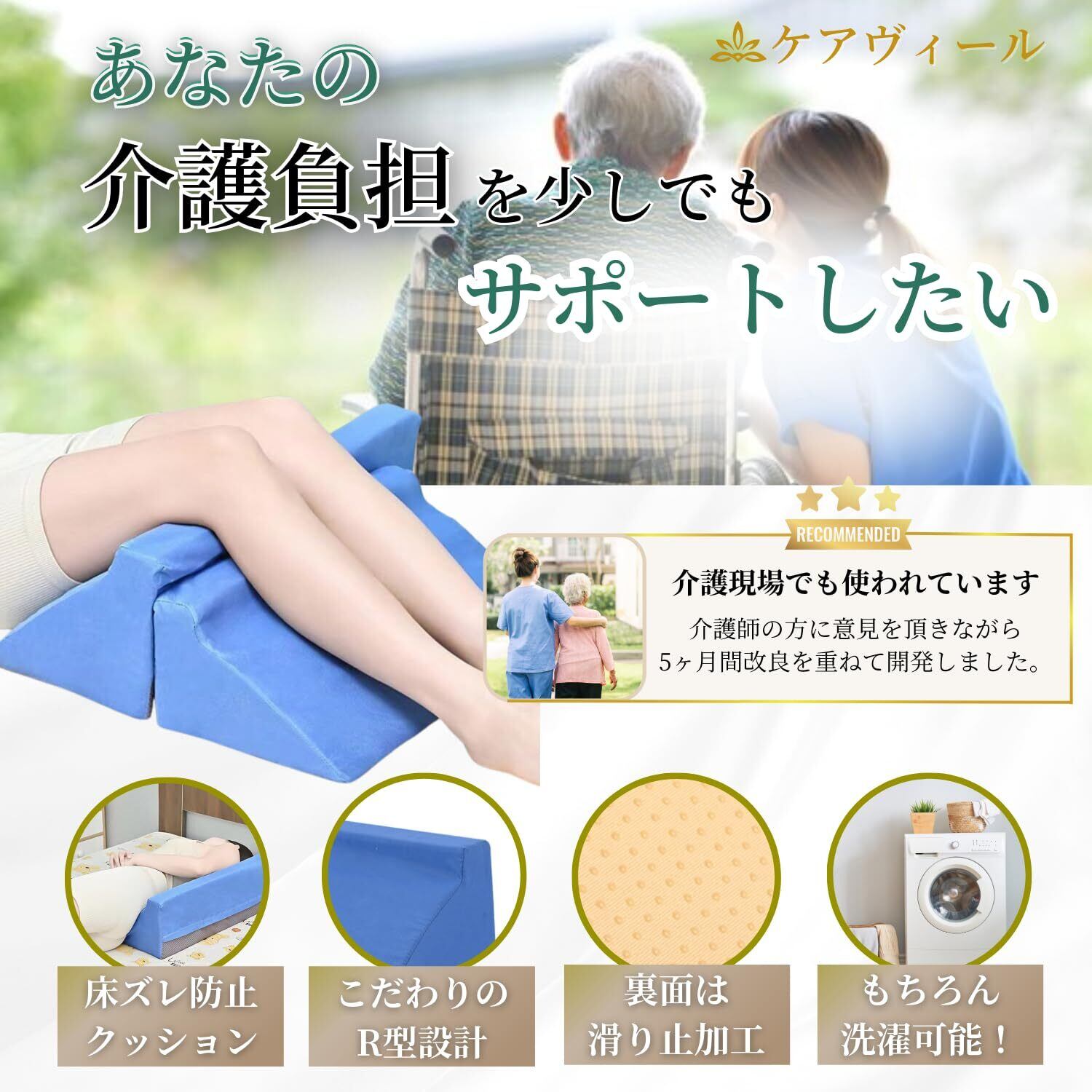 【高反発素材】 弾力性に優れながら、身体が沈み込まない適度な硬さでしっかりと支えます。計算された介護に最適な斜めの角度38度で体の曲線に合わせて体勢をキープでき、側臥位・仰臥位時の除圧、足上げ、寝返りの介助をスムーズに行えます。高反発素材により、身体への負担が軽くなります。これにより、被介護者は快適に過ごすことができ、介護者も簡単に介助を行うことができます。