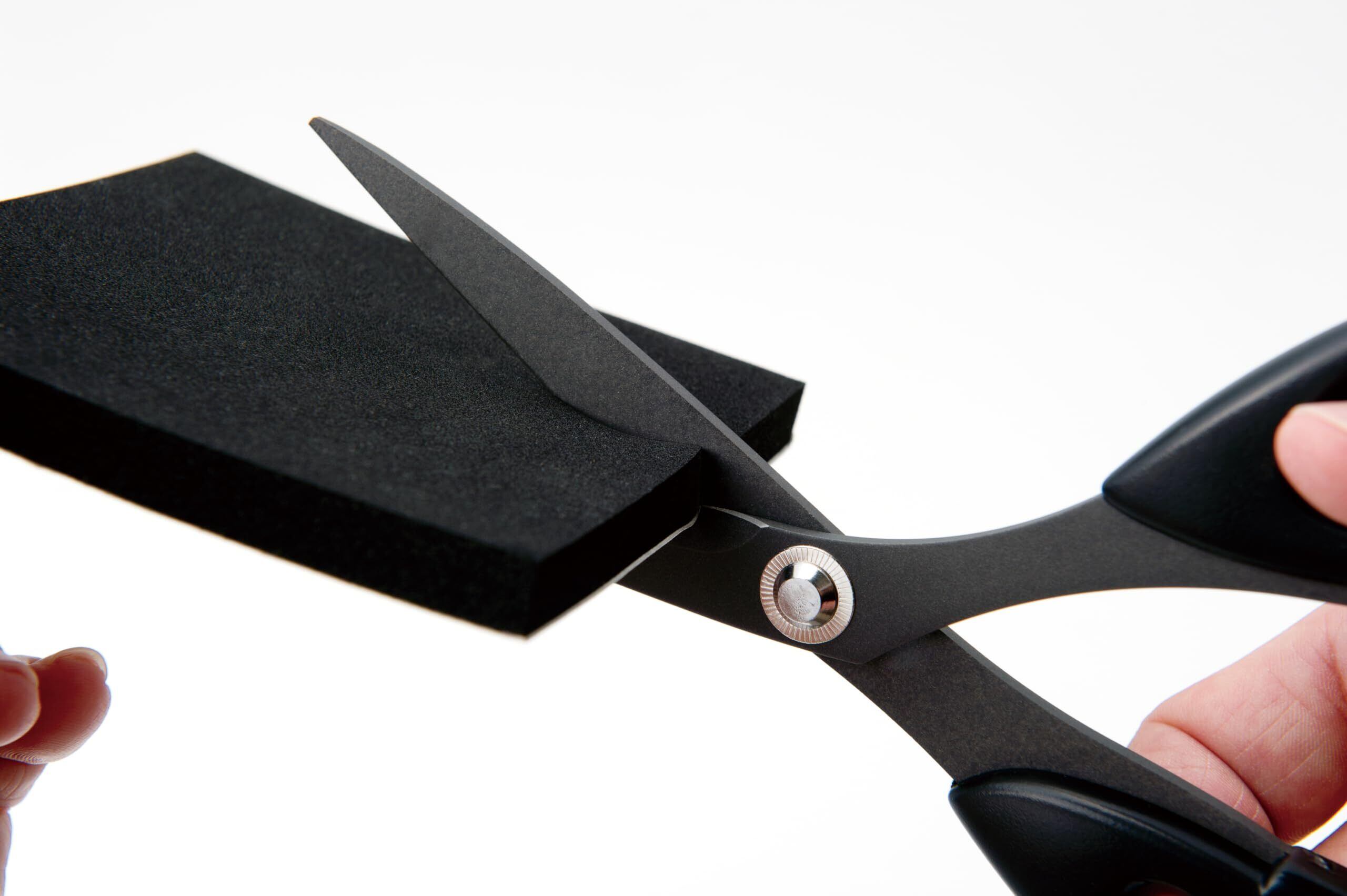 フッ素加工だからべたづかず、ギザ刃付きだからすべらないはさみです。