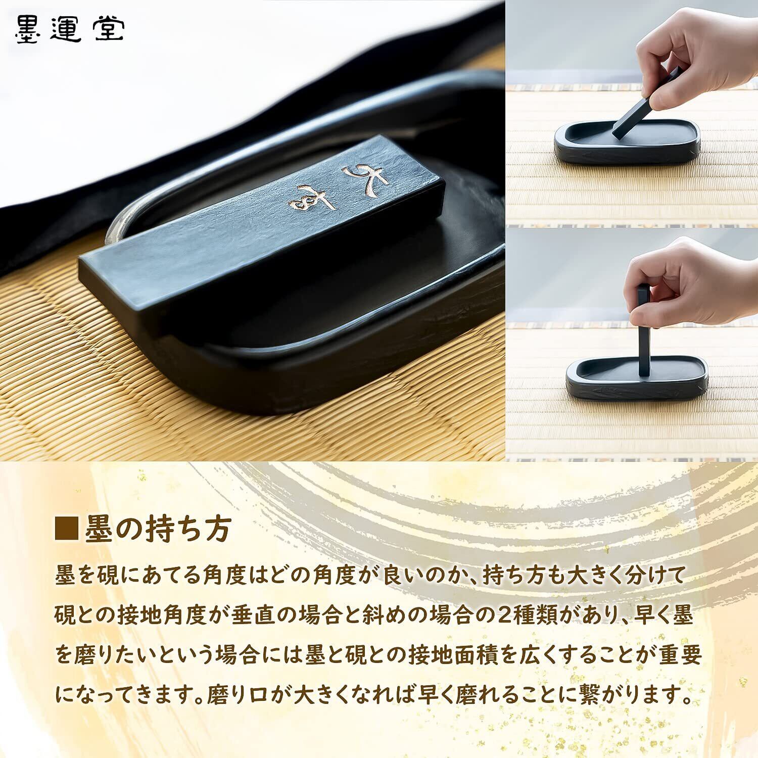 滑らかな磨り味で、運筆軽く、のびが良く「厚みがある黒の強い線」が表現できる墨で、煤の量が多く早く濃くなる。