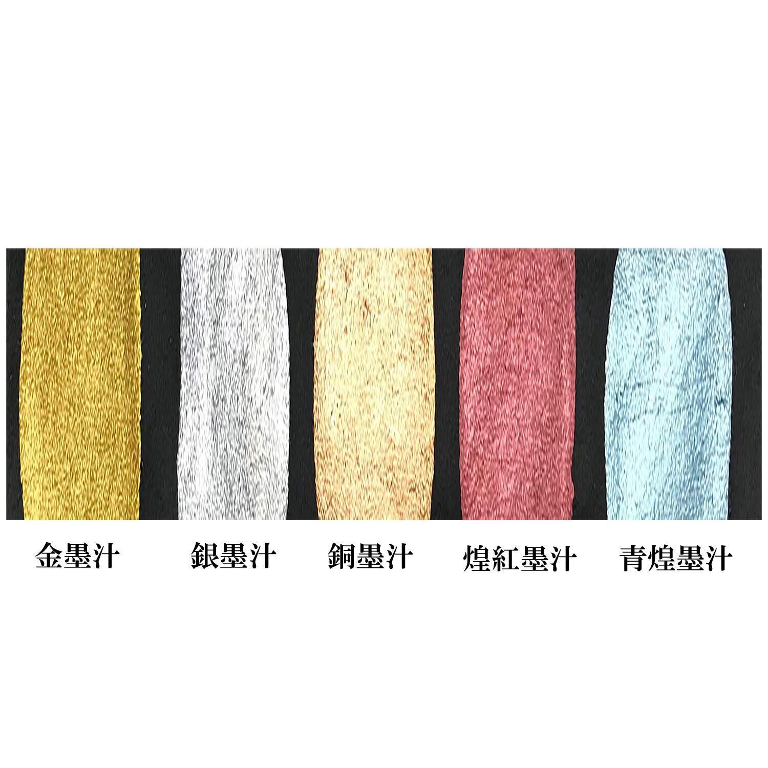 書き味なめらかで光沢のある銅色です。有機溶剤を使用せず環境に配慮しました。銅色顔料を墨汁の製法で製造しているので、裏打地・表装が可能です。銀墨汁に銅墨汁を足すことでピンクゴールド等の色が再現できます。ご使用前に容器を振ってよく混ぜてください。ご使用後は容器のキャップを閉めて、使った道具はすぐに水洗いをしてください。残った液は元の容器に戻さないでください。衣服等に液がつきますと落ちません。幼児の手に届かない所に置いてください。目や口に入らないようにご注意ください。