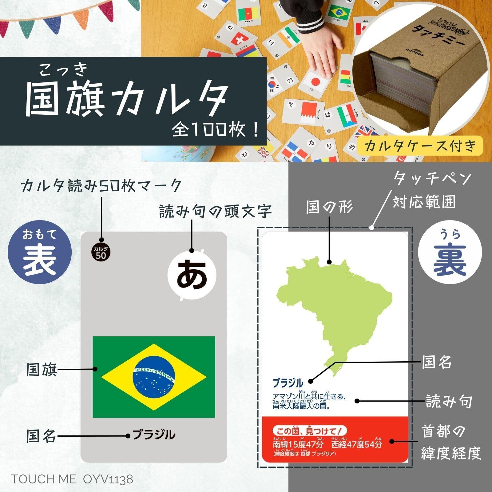 【しゃべる国旗カルタ】全100枚。ゲームを通して国旗を覚えたり、国について深く学ぶことができます。1人でも複数人でも、お子様から大人まで楽しみながら学ぶことができます。