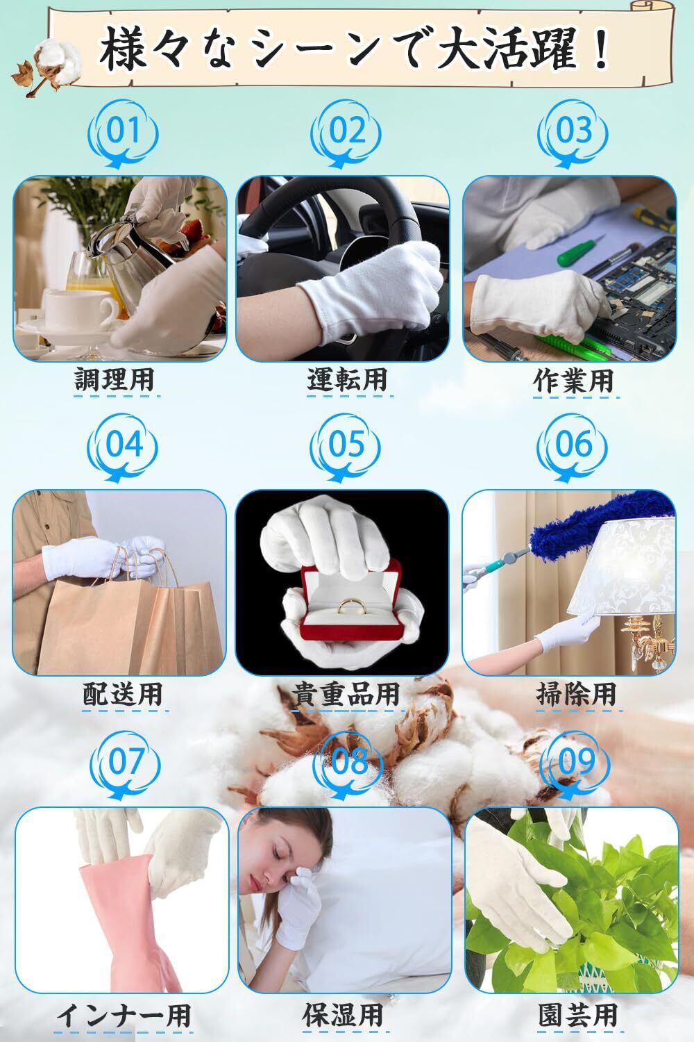 【用途に合わせて気軽に使用可能!】 手の保護手袋として、家庭や仕事場での常備アイテムで、用途に合わせて気軽に使用できる薄手白手袋です。純綿100%使い捨て布手袋は作業、運転(ドライバー)、貴重品、家事のお掃除、鑑定、検品、就寝、夜用、ドライバー、タクシー、応援団、農業、選挙、警備員、ジュエリー、園芸、接客用手袋なとしてお使いいただけます。白い手袋は手荒れ・主婦湿疹・ひび割れ・アレルギー・乾燥肌・割れやすい爪・角質・アトピー等の皮膚炎の方などでお悩みの方に是非オススメです。