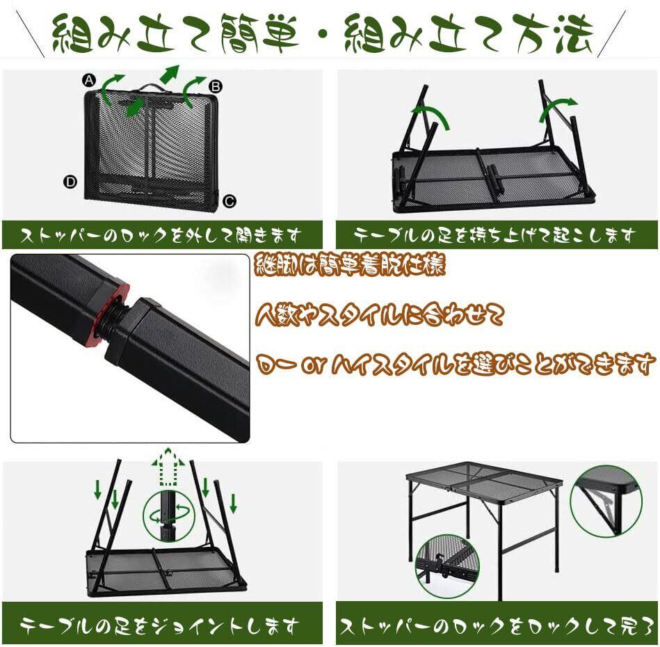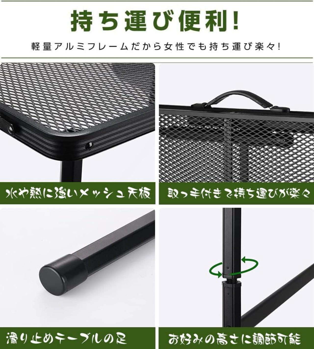 キャンプ テーブル アウトドア メッシュ 熱・水に強い 二つ折り 組立簡単 軽量 コンパクト ローテーブル 耐荷重25kg 耐熱200度 高さ2段階調整可能 収納袋付き Black