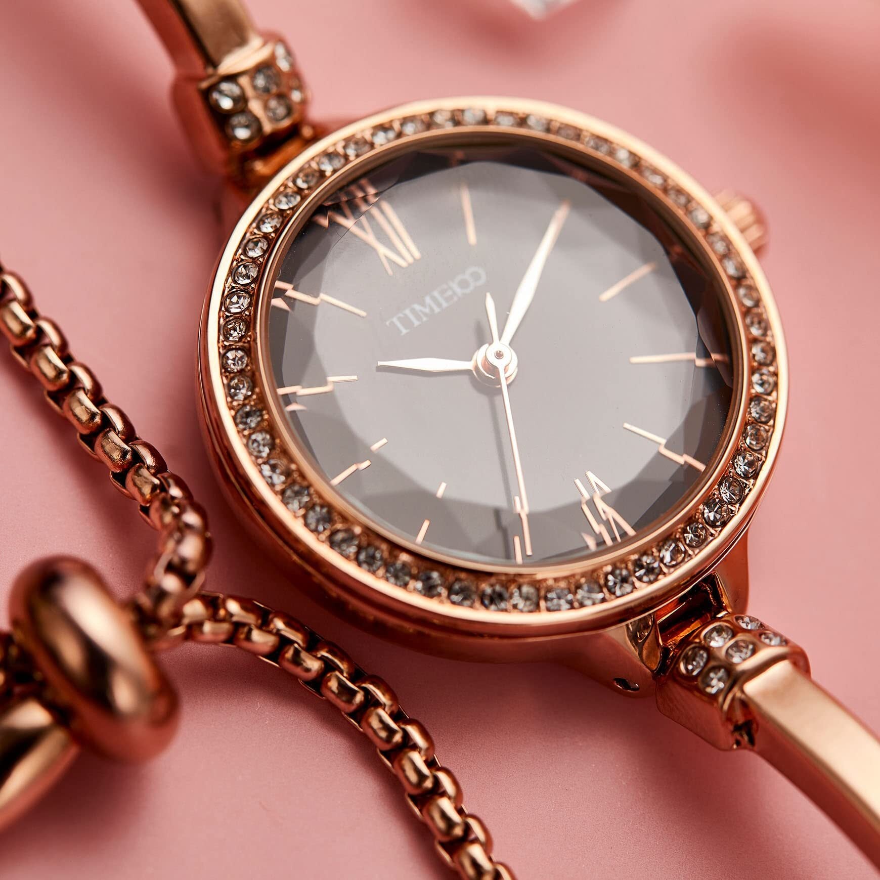 【デザイン】カット多面体クリスタルミラーがダイヤモンドのように反射し、光り輝く夏向けのエレガントなデザイン、ベルトはブレスレットデザインで、自由に調節でき、装着しやすい。