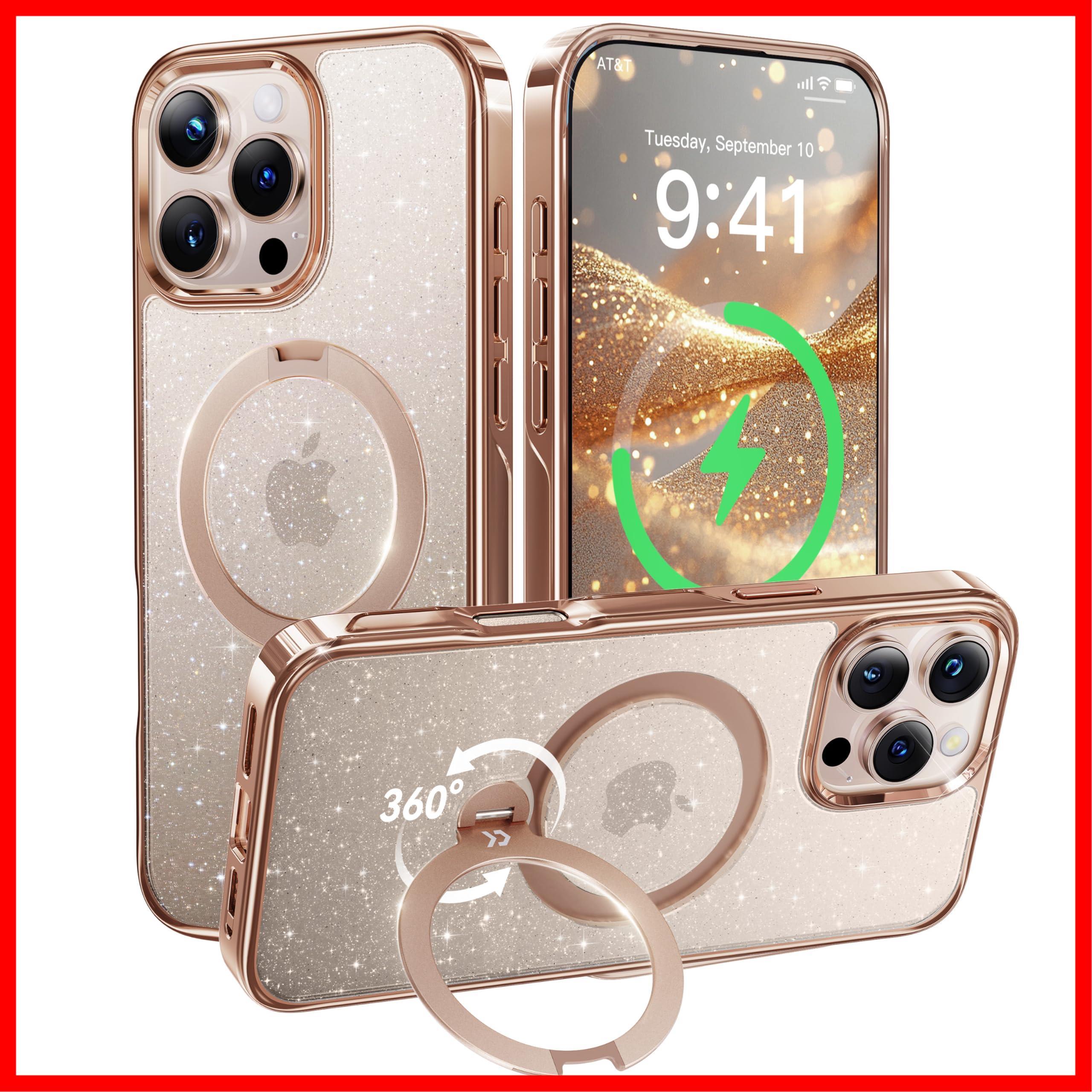 【極上の透明感・360°全方向スタンド】CASEKOO iPhone 16 Pro 用ケース ラメ仕上げ クリア 耐黄変 横縦両立 角度自在 MagSafe対応 米軍規格保護 耐衝撃 高耐久性 超強磁力 最大25W急速充電対応 フィット感 ラップホール付き 透明 いphone16pro 用ケース 6.3インチ「MagicStand Pro Glitter」(ラメ入りゴールド) | ニコニコshops