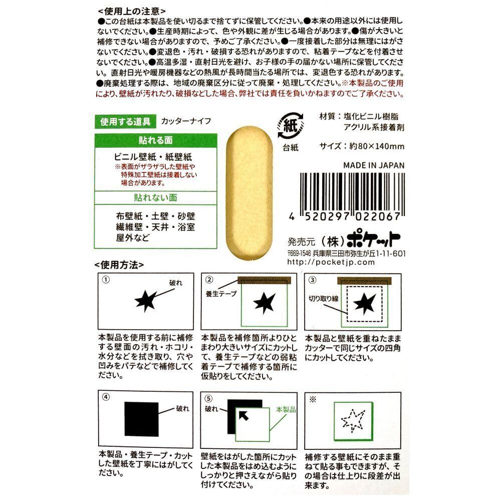 補修用壁紙シールです。 必要サイズにカットして、補修する部分に貼り付けます。 ノリ不要のシールタイプでピタッと貼るだけ簡単です。 壁紙の汚れや破れの補修にお使いください。 ※布壁紙・土壁・砂壁・繊維壁・天井・浴室・屋外等には使用できません。 サイズ(約)8cm × 14cm。 材質・塩化ビニル樹脂。 日本製