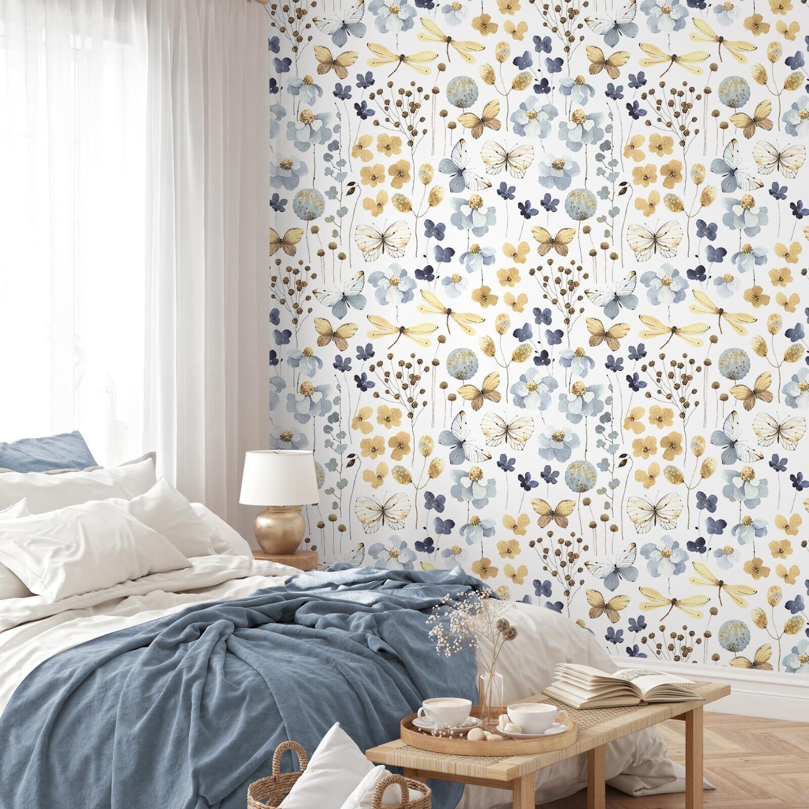 【北欧×和モダンデザイン】淡いブルーとベージュの水彩タッチで、繊細な小花と優雅な蝶が舞うおしゃれな花柄。北欧テイストに和の趣きを融合した上品なインテリアアクセント