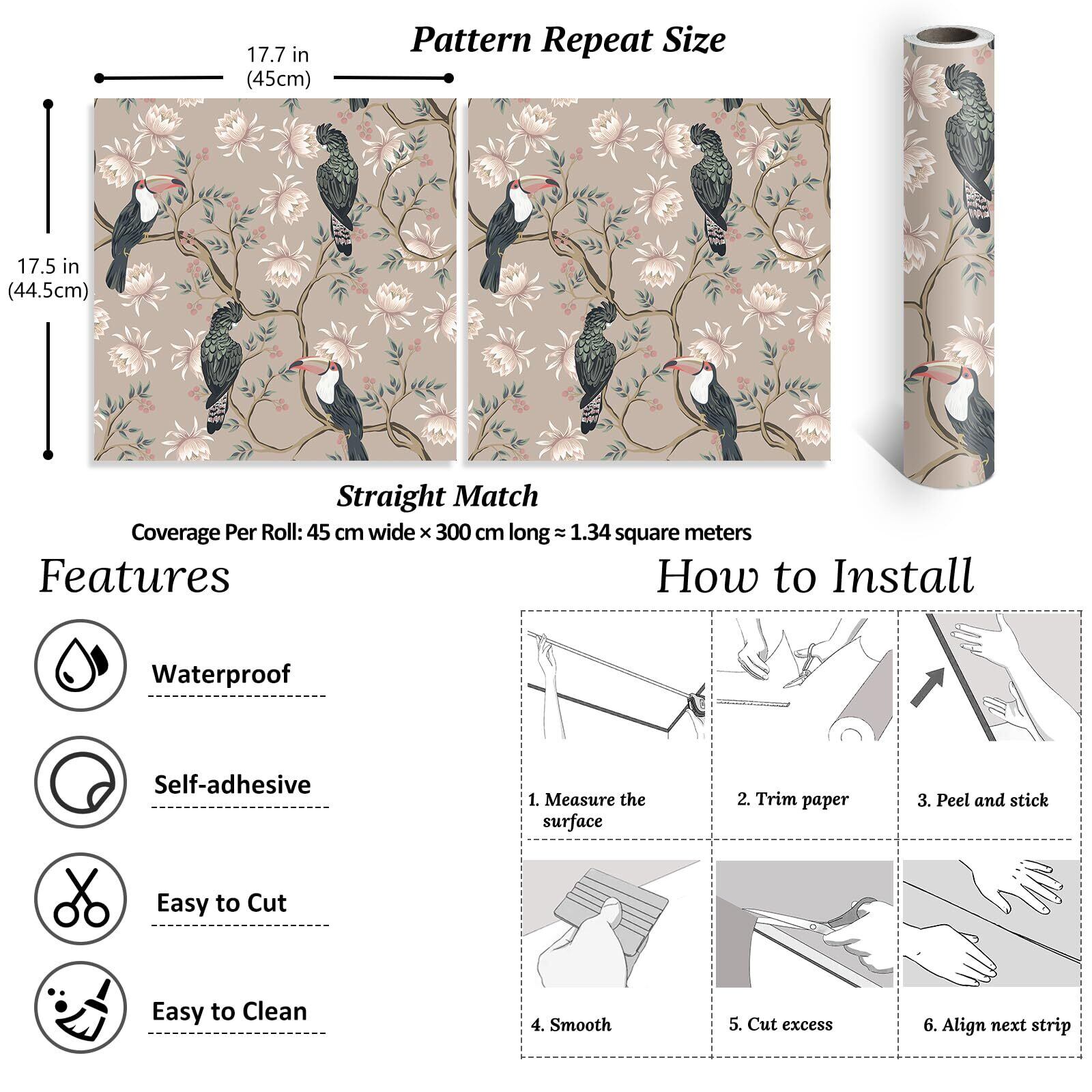 VEELIKE 壁紙シール リメイクシート 花鳥柄 クロス 和風 ベージュ 44.5×300cm 防水 耐熱 シールタイプ 壁紙シート カッティングシート 襖紙 ふすま紙 ウォールステッカー リフォーム りめいく 厚手 はがせる 剥がせる のり付き 賃貸 デスク テーブル 机 天板 玄関 キッチン トイレ デコレーション アクセント インテリア アンティーク ヴィンテージ 北欧 和モダン