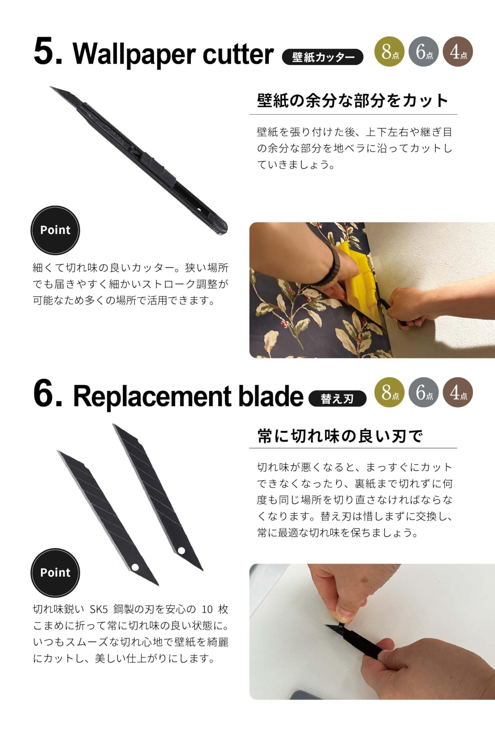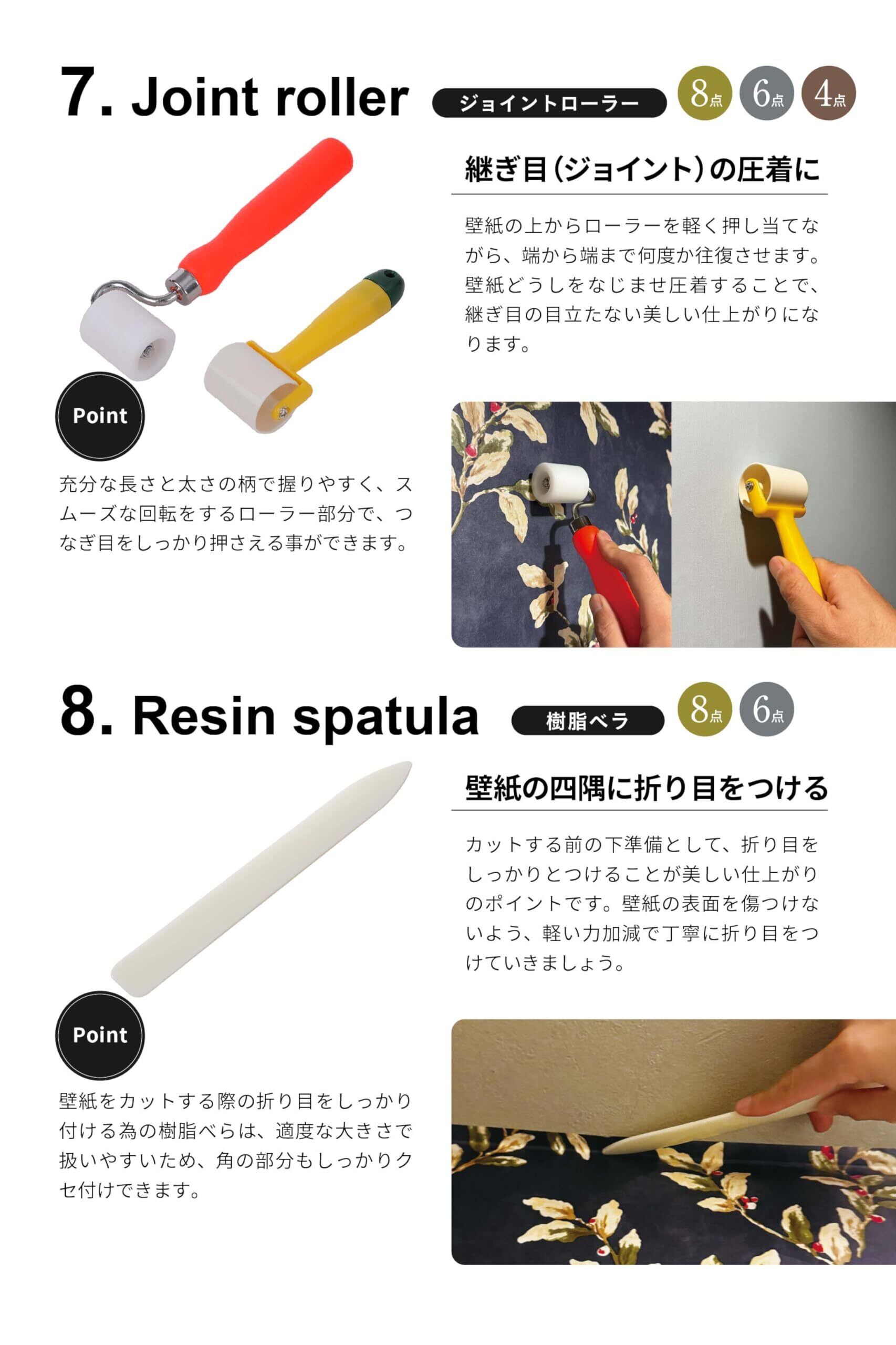 【8点フルセット】必要な道具を全て揃えたフルセット!初心者でも扱いやすく、高品質な仕上りを実現。 セット内容:1.ジョイントローラー(大) 2.壁紙カッター 3.替え刃 4.地ベラ 5.樹脂べら 6.保護布付きスキージー 7.キージー 8.壁紙ハサミ