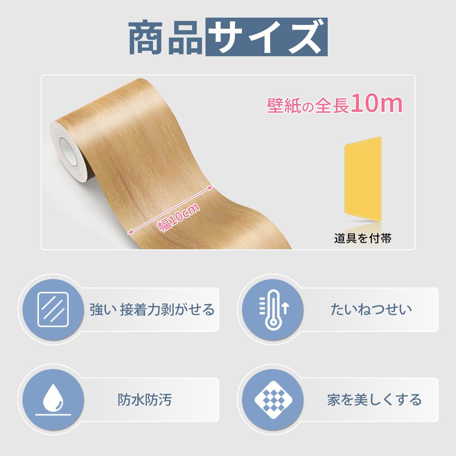 【貼りやすい剥がせる壁紙シール】木目調テープの裏面に粘着剤が付いており、そのまま貼り付けられる。貼ってはがせる木目シートですが、しわや破れなどになりにくいタイプで、キレイに貼れます。10cmの幅で、初心者一人でも簡単で仕上がります、賃貸でも安心にご利用いただけます。