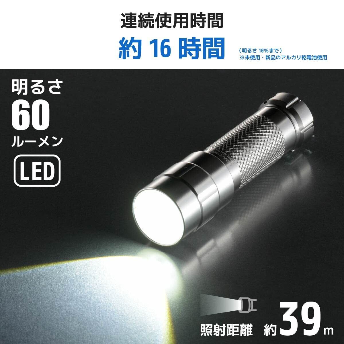 【 仕 様 】 ◆電源:単3形乾電池1本(別売) ◆光源:白色系LED1個(LED交換不可) ◆最大消費電流:約150mA ◆連続使用時間:※未使用・新品のアルカリ乾電池使用時 明るさ10%まで約16時間、明るさ5 lmまで約17.5時間 ◆光束:約60 lm(ルーメン) ◆照射距離:約39m
