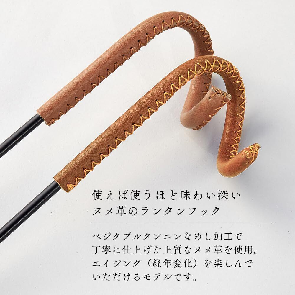 無骨なブラックアイアンにレザーを組み合わせた、上質感のあるランタンフック。贅沢にベジタブルタンニンで鞣したヌメ革を使用しており、革のエイジングを存分に楽しんでいただけるモデルです。