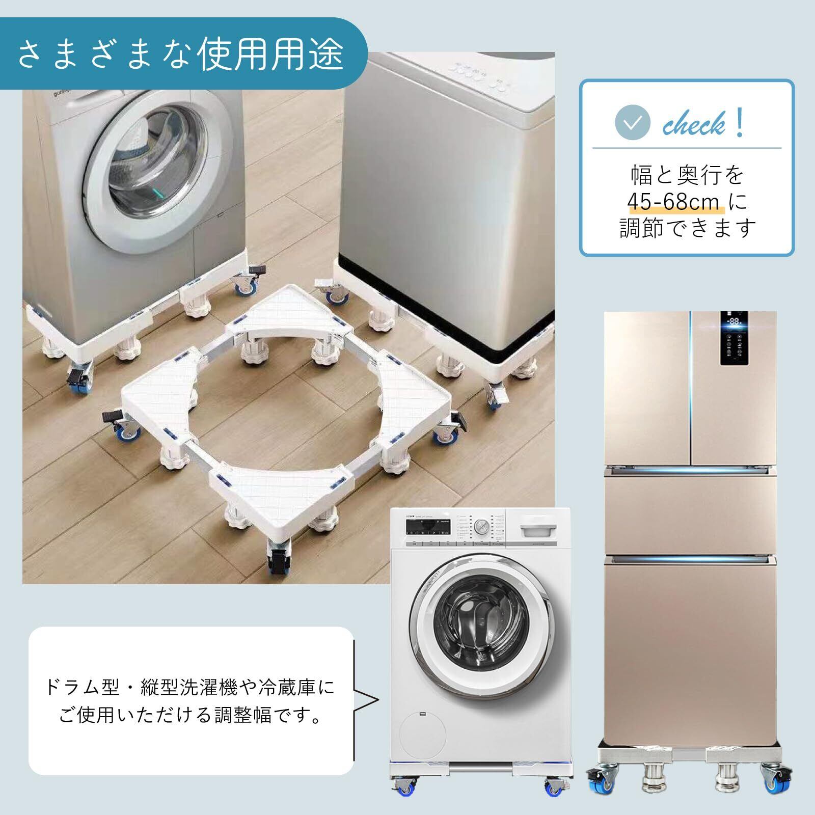 【サイズ調整可能】洗濯機台の幅・奥行きが45-68cm、10-13cmの高さ調整が可能です。ドラム式洗濯機や縦型洗濯機、冷蔵庫、食器棚、什器など、さまざまな用途でご使用いただけます。10cm-13cmのかさ上げができるので、排水ホースの取り回しが難しい場合でも安心です。