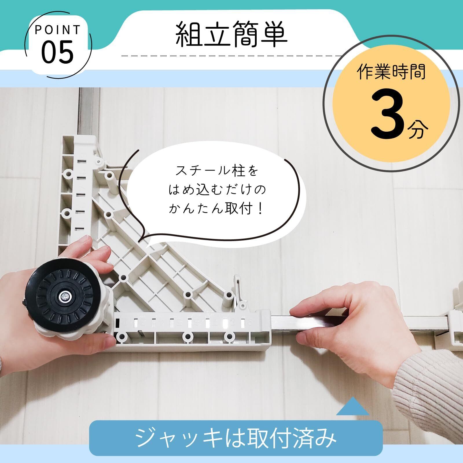 【組立簡単】洗濯機台の本体プレートにはジャッキが装着済みで、3分で組立できます。ねじ締めなどもなく、スチール柱をはめ込んでロックをかけて完了です。