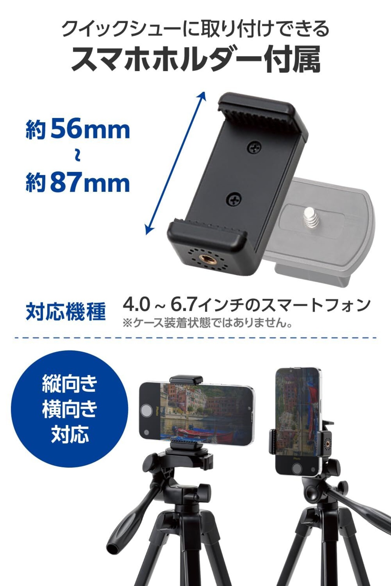■カメラの着脱がワンタッチでできるクイックシューと、4.0~6.7インチのスマートフォンに対応しているスマホホルダーを付属しています。カメラだけでなくスマートフォンでも使用が可能です。