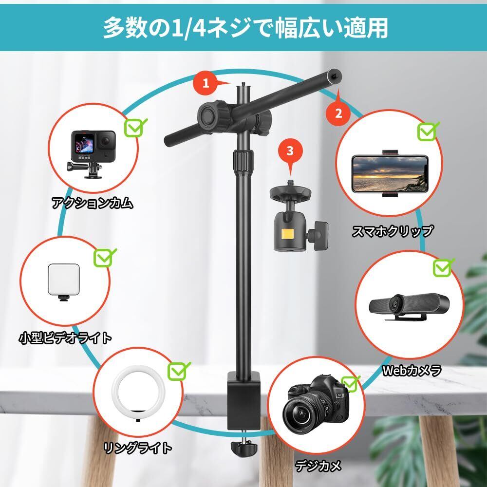 【カメラクランプ式台座&多数の1/4ネジ】❶台座のカメラクランプは全体を大きくしております。そのため、デスクとの接触面がより広くなります。また、挟める両側には滑り止めゴムパッドも備わって、固定場所に傷つけないでがっちり固定できます。❷標準1/4ネジ付きのスタンド&クロスバ&自由雲台にはリングライト、アクションガム、ビデオライト、パネルライト、スマートフォンなど、1/4インチネジ穴付きの撮影設備やアクセサリーにも対応します。