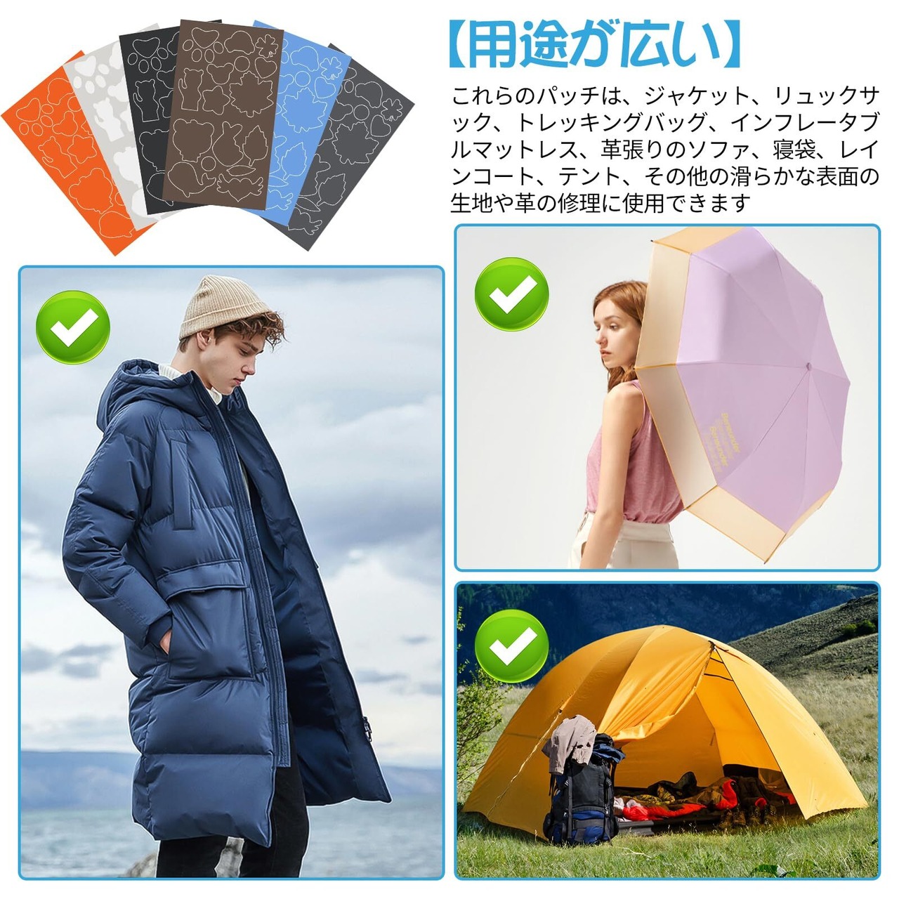 【幅広い用途】これらの修理布は、ダウンジャケット、ジャケット、ジャケット、レインコート、傘、ハイキングバッグ、テント、寝袋、その他の表面が滑らかな生地を修理できます。好きなパターンを選択し、穴や擦り傷を修復して寿命を延ばし、よりユニークな外観にすることができます。