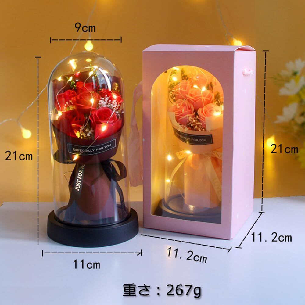 6輪ローズ カーネーション フレグランスソープフラワー フェアリー ギフトボックス バラ ガラスドーム LEDライト 枯れない花 シャボンフラワー お祝い 還暦祝い 退職祝い 記念日 お見舞い ギフト (オレンジ)