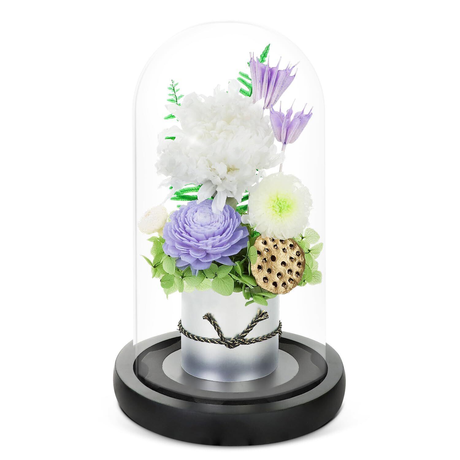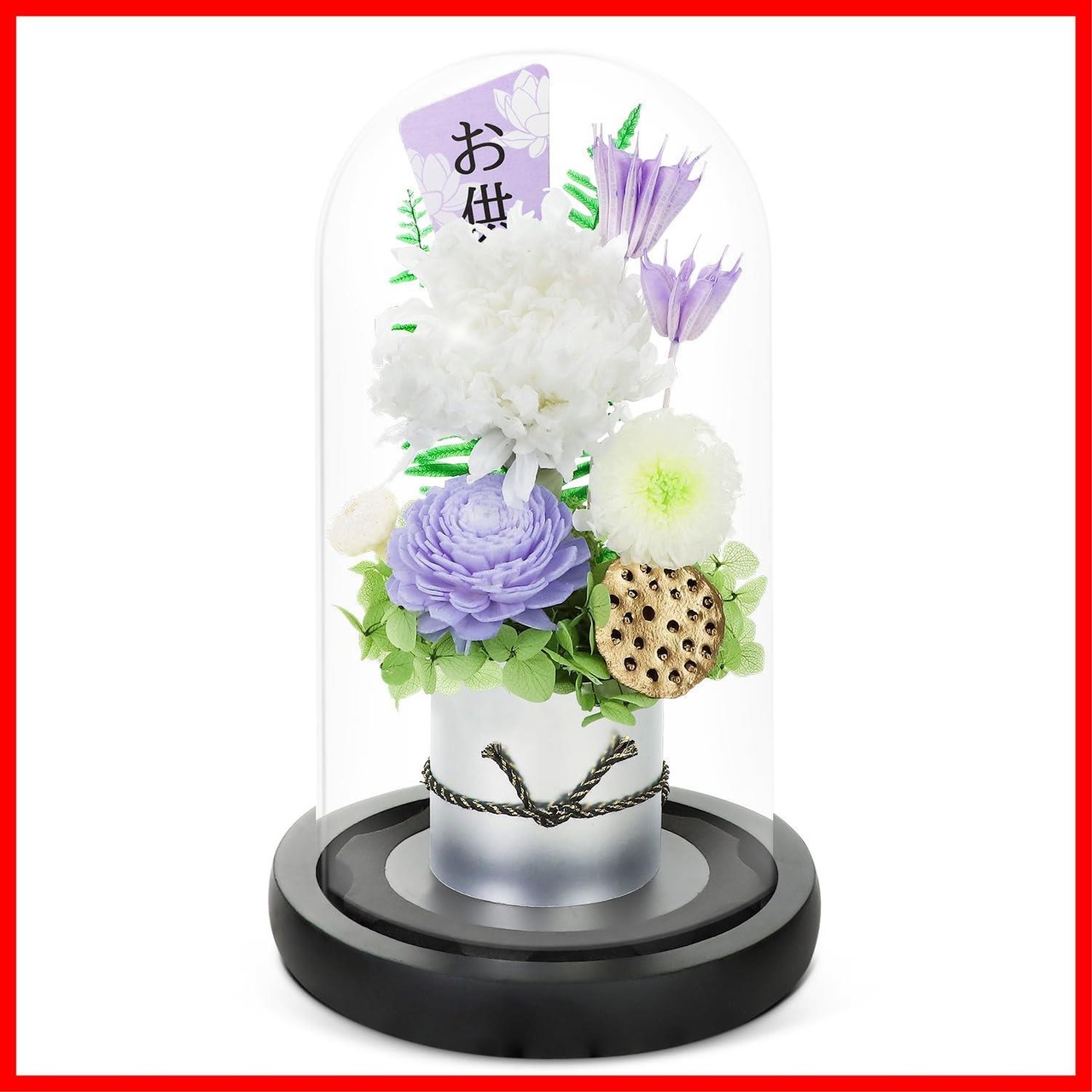 【材質と仕様】様々なものが多い仏壇の前でもすぐに飾りやすいサイズとなっております。花器:ガラス製ドーム型ケース。サイズ:直径13.5cmX高さ19cm(受皿とドームも含みます)。ガラス(ドームの蓋は取り外し可能)、木製台座。【お供】の札が付き。ガラスの透明感や光の反射が花の美しさを引き立て、目が付くたびに癒やされます。