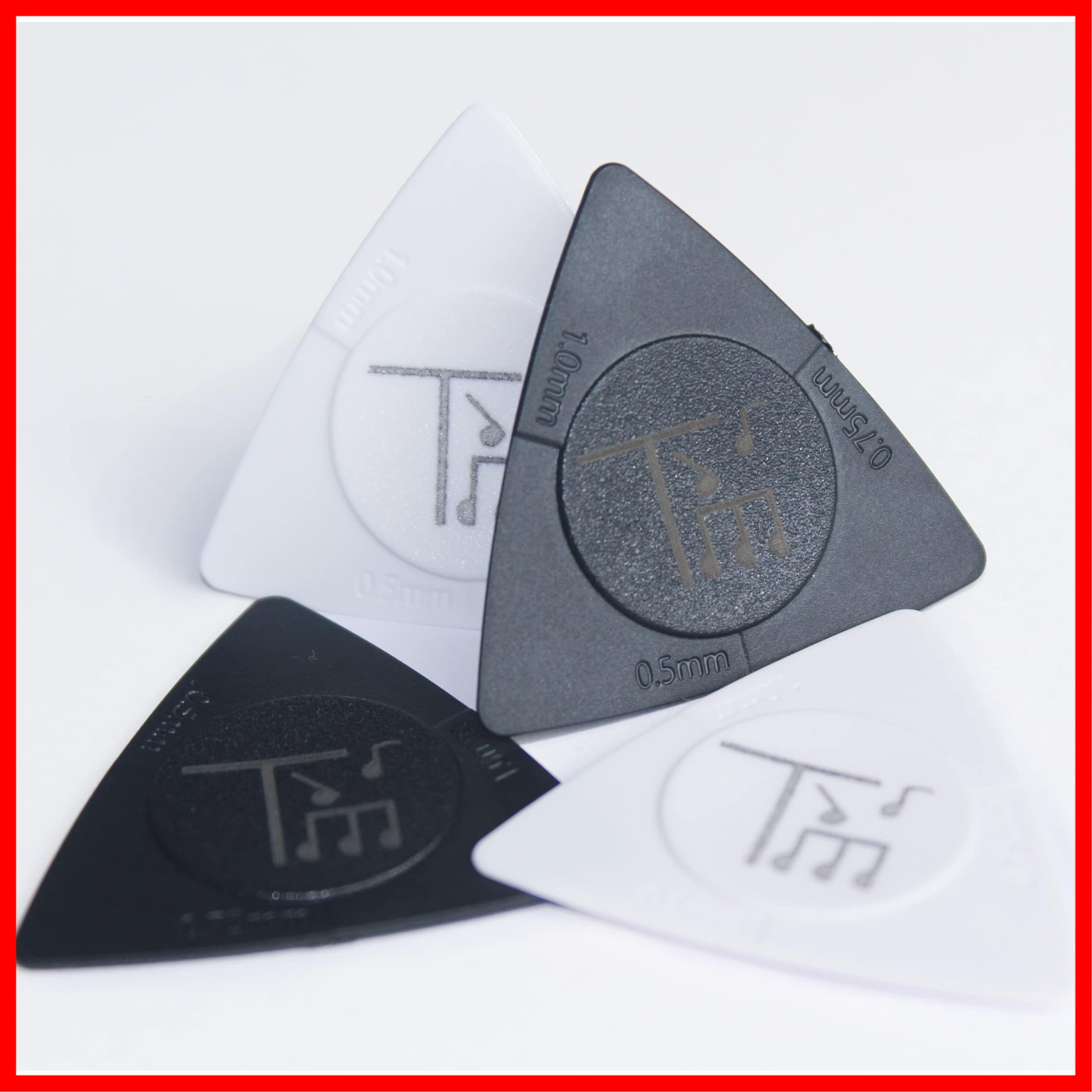 「ユニークで機能性に優れたギターピック」 ユニークな三角形のフォルムで、普通のピックとは違う独特のルックスが特徴。黒と白のコントラストがスタイリッシュでアコースティックギターにもエレキギターにも使えるピック。暗い曲には黒、明るい曲には白。ピックはなくしやすいので各2枚ずつ入っています。
