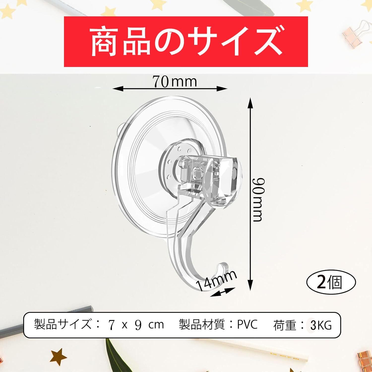 セット内容とサイズ:吸盤フック 2 個入り。全長約 9cm