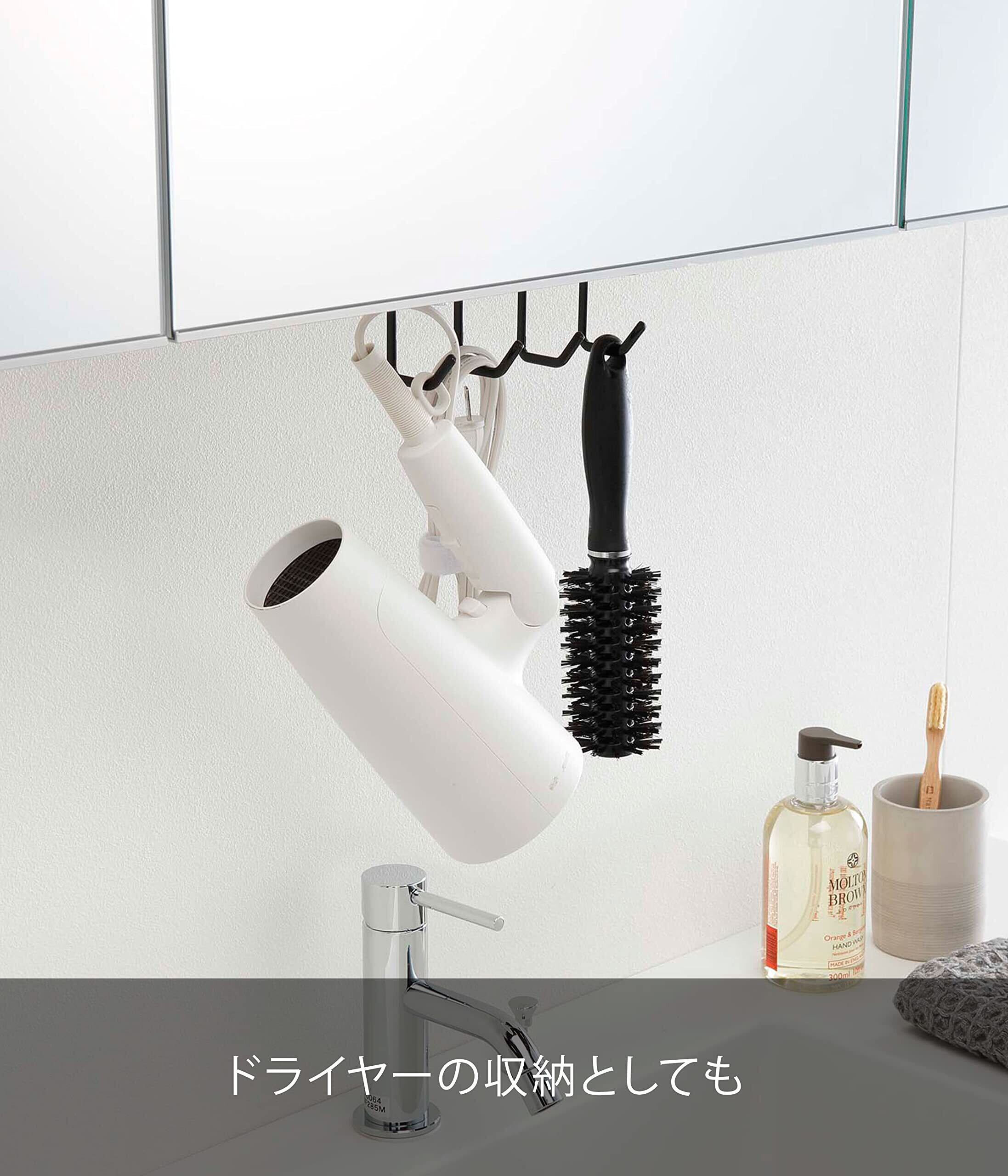 洗面所の吊り戸棚に浮かせて取り付けられるフック4連!洗面台に浮かせてスッキリ整頓!引っ掛けて収納するだけ!ドライヤーやブラシの収納にも!調整ネジでしっかり固定!
