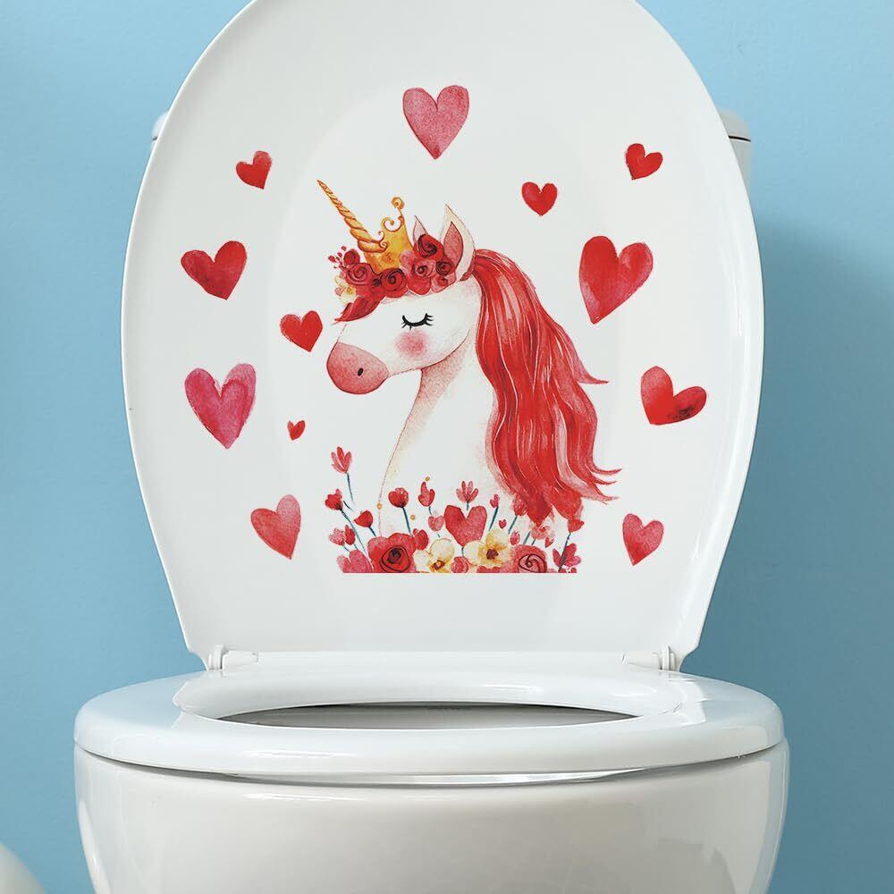 便器 シール ウォールステッカー 動物 可愛い トイレ用ウォールステッカー, ユニコーンと赤いハート柄,トイレ ステッカー おしゃれ,トイレタンク 飾り,かわいい動物 便器 ステッカー ,toilet sticker 便器に貼るシール 29×29cm, 防水デコレーションシール