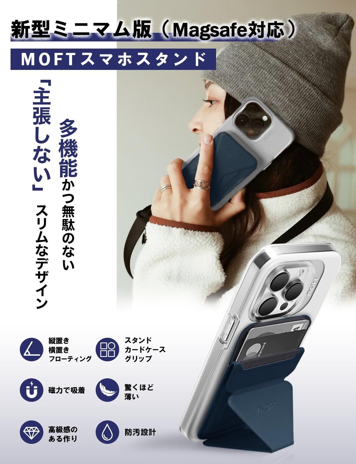 MOFT Snap On 【薄型&43g超軽量&カード最大3枚収納タイプ】 スマホスタンド エッジ加工 滑らかな手触り マグセーフ 対応 iPhone15 iPhone14 iPhone13 iPhone12 スマホスタンド ケース カバー Magsafe 対応 磁力吸着 脱着簡単 ヴィーガンレザー (ディープブルー) | ニコニコshops