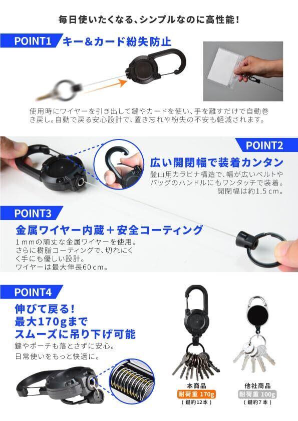 アイデア次第で使い方無限大!伸縮リールで便利を拡張 「この色もいいけど、あっちの色も気になる…」「気分や持ち物に合わせて使い分けたい」——そんなあなたに朗報です!私たちのカラビナは、定番のブラックから、鮮やかなアクセントカラーまで、ファッションやライフスタイルに合わせて選べる豊富な9色展開です。ただの便利ツールを超え、あなたの個性を表現するアイテムとしてもお活躍します。 一つのカラビナで十分な便利さを実感できます。しかし、色のバリエーションを活かせば、さらにあなたの日常はスマートに、そしてクリエイティブに変わるでしょう。 持ち物の色分け: 鍵用、パスケース用など、色で識別することで、必要なものを迷わずサッと取り出せます。 ファッションのアクセントに: その日の服装やバッグの色に合わせてカラビナを選べば、さりげないおしゃれを演出できます。 用途ごとの整理: アウトドア用品やDIYツールなど、アイテムの種類ごとに色を変えて整理することで、探す手間が省けて効率も上がります。 大切な人とのリンクアイテム: お揃いや色違いで持てば、さりげない絆を感じられるアイテムとしても魅力的です。 「リールは壊れやすい」そんなイメージを覆します。当社のカラビナは、内部に高強度な金属ワイヤーを内蔵。サビに強く、摩擦にも耐える設計で、日常使いはもちろん、アウトドアなどのタフな環境でも頼りになります。 さらに、最大170gまで対応するスムーズな自動巻取機能も搭載。鍵束や少し重めのパスケース、小型のツールなどを取り付けても、たるまずピタッと戻ります。必要な時にスッと伸び、使わない時はしっかり収まる、ストレスフリーな使い心地をぜひご体験ください。 大きく開く頑丈なカラビナは、ジーパンのベルトループやリュックの太いショルダー部分にも簡単に取り付け可能です。様々な場所で活躍します。これだけの機能とサイズでありながら、本体重量は驚きの約29グラムという軽量設計を実現しました。重さを感じさせず、快適な携帯性を実現しました。 鍵や定期券をスマートに、素早く取り出したい方 60cm伸びる長いリールで、もっと便利にしたい方 ジーパンや太いベルトにもしっかり取り付けたい方 軽量で丈夫なカラビナをお探しの方 普段使いからアウトドアまで、様々なシーンで活躍するアイテムが欲しい方