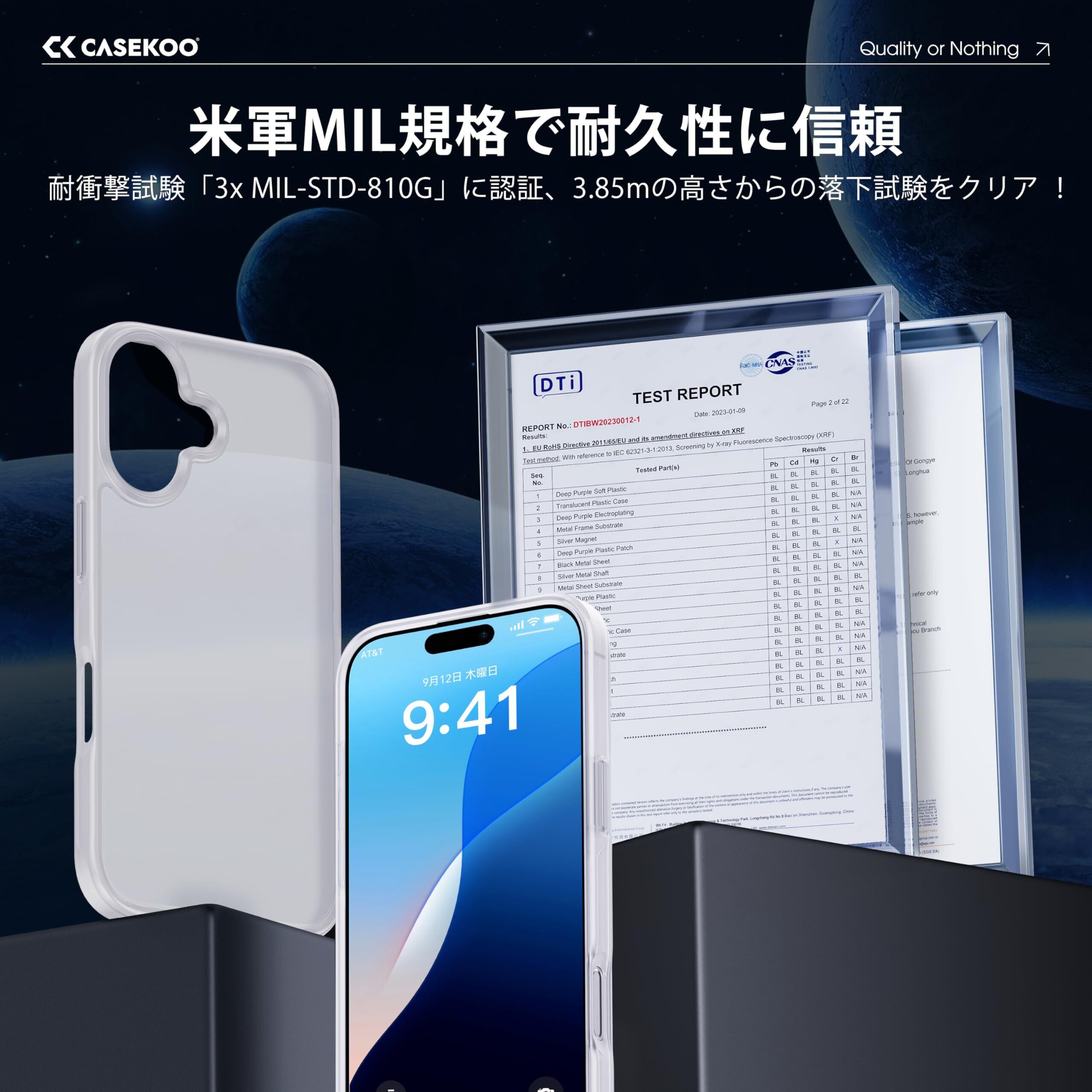 【米軍MIL規格・指紋防止】CASEKOO iPhone 16 用 ケース 耐衝撃 滑り止め 指紋防止 米軍MIL規格 マット仕上げ ストラップホール付き 黄変防止 耐久性 カバー ワイヤレス充電対応 アイフォン 16 用 6.1 インチ ケース(マットクリア) | ニコニコshops